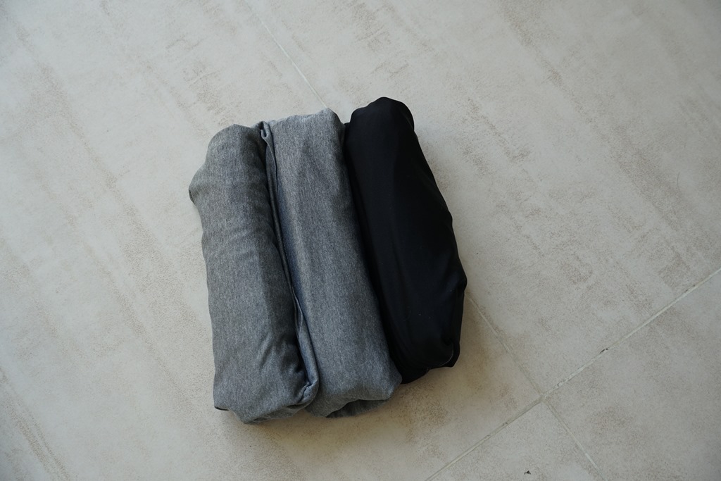 收拾內衣褲當然也非常重要,因為比較不用在乎會不會皺,所以基本上會以節省空間的收納方式為主。相信用捲的方式大家都會,我會在開始收折時將衣服下襬往反方向折一摺,這樣捲起後就可最下方那一摺像套袋一樣把衣服包起並固定。