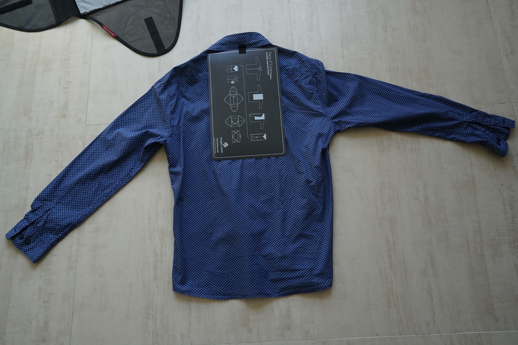 袋裡的夾板還有貼心的折衣指南,讓你可以藉由這板子輕鬆將襯衫折成與袋子一樣大小,當然這樣才能放進打襯衫打理袋中,是非常便利的方式。