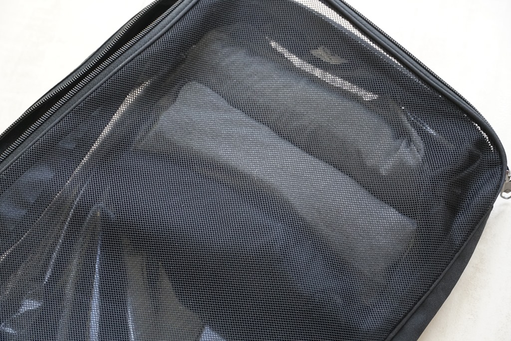 主空間中還有衣物固定網,如果衣物沒有習慣以專屬衣袋妥善保護時,這固定網與束帶可以將直接置放在行李箱的衣服加以固定,衣服就不會因為晃動而產生皺摺。不過我的習慣是會使用收納袋先將衣服整理好後才放入行李箱內,這個我們後面會再提到。