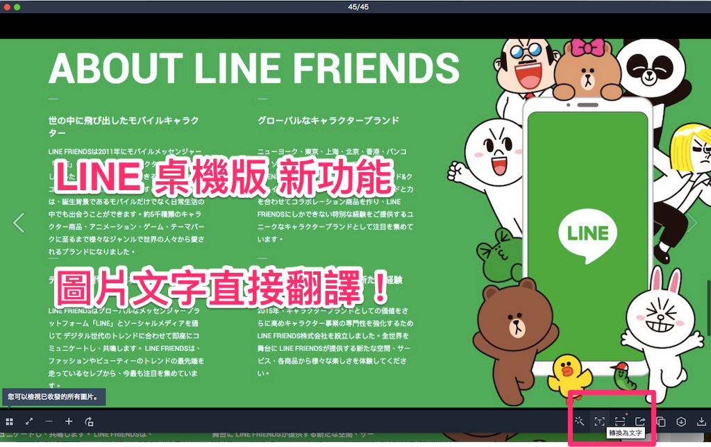 使用的方法也的確相當簡單,首先先下載並開啟桌機版的 LINE、接著從對話視窗裡挑選有文字想要翻譯的圖片,再點選右下方的 “T” 圖示,也就是 “轉換為文字” 選項。