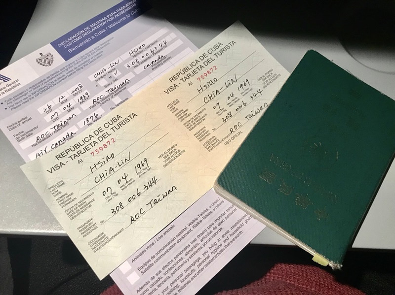 雖然從加拿大進古巴不用辦簽証,但到古巴旅行還是要花錢購買「觀光卡」(類似入境卡),有趣的是這卡在不同的國家、不同的機場(航空公司櫃台就有買)購買價格都不一樣(一般來說大約是20-30美金),網路上據說有人花80多美金才買到,而搭加拿大航空會有一張免費的入境卡(但切記不要寫錯,因為第二張就要收約20左右加幣…),這也是之所以為什麼我們會選擇加拿大航空的原因之一。