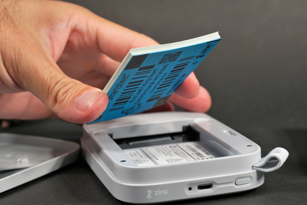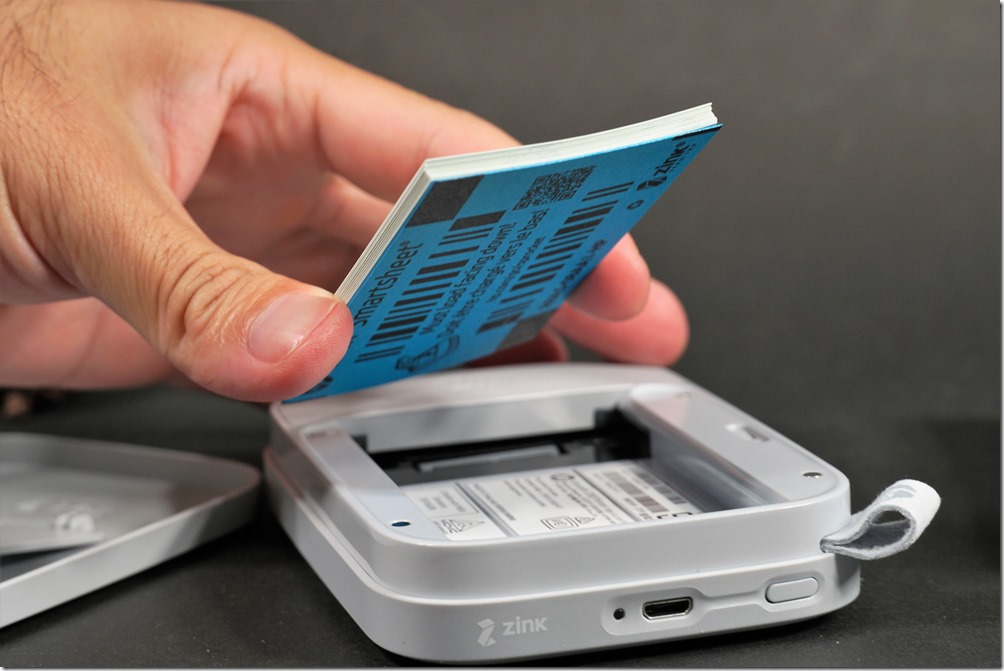 HP Sprocket 使用熱感式相紙,安裝時只要將相紙包裝打開,把藍色卡紙那面朝下放進相紙槽中即可,放妥打開電源後,藍色卡紙會自動吐出來,這目的是為了讓你不要放錯面外,還有校準功能,建議每次開機前將小藍卡放進最底下校準,畫質會更好。另外不要嘗試一次放進兩包相紙,因為 Kisplay 有好奇放過,結果上蓋是蓋不起來的。