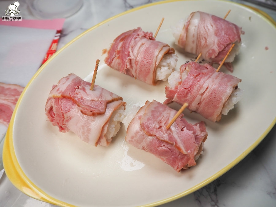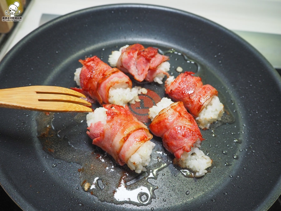 可以使用前天沒吃完的米飯,捏成橢圓形,使用培根肉包起來即可