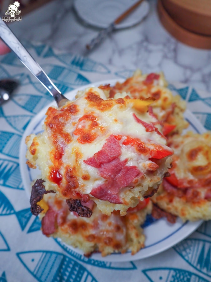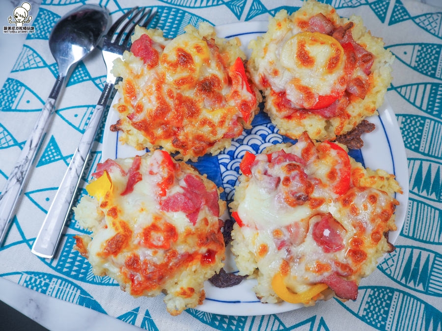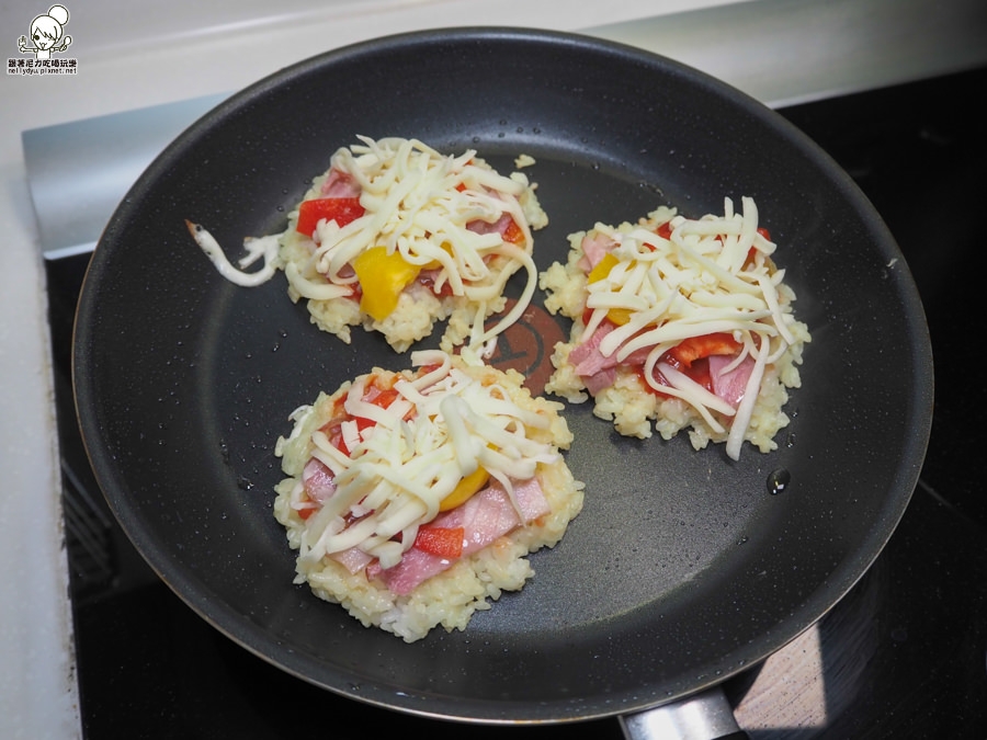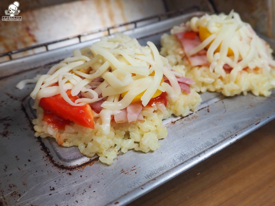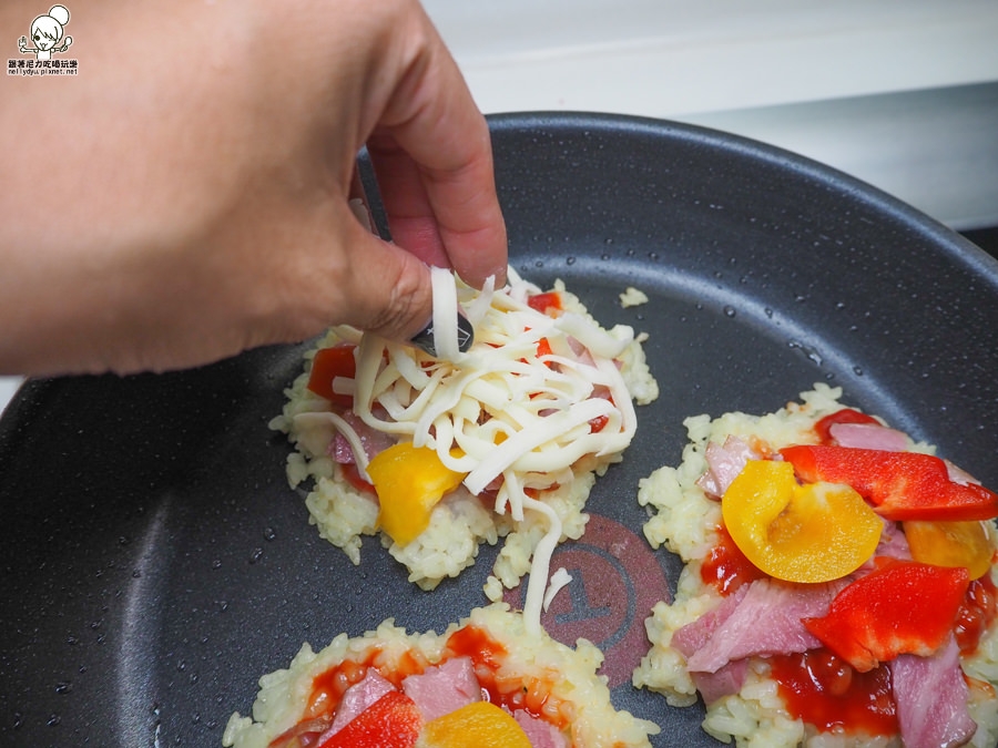 米粒要先用蛋液沾濕,讓米粒可以附著在一起,當做米披薩基底