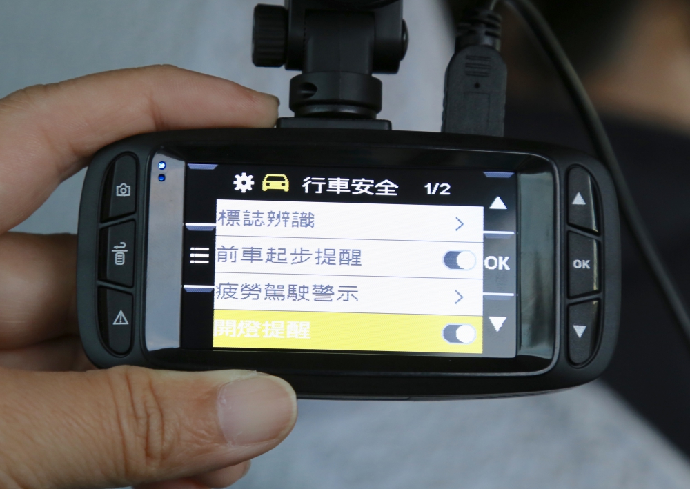 在行車安全警示內建的設定項目有:標誌辨識、前車起步提醒、疲勞駕駛警示、開燈提醒、測速照相提示、超速警示。