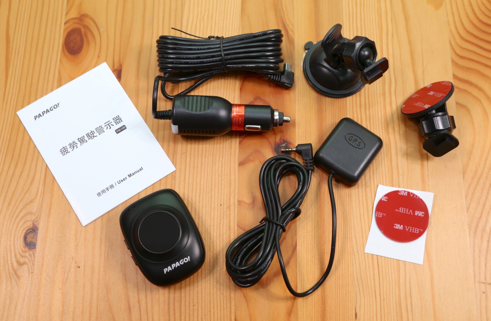 內盒標準配備有:主機、使用手冊、GPS 2M 天線、3.5 M 車充線、雙支架、黏式吸盤、備用 3M 貼紙。