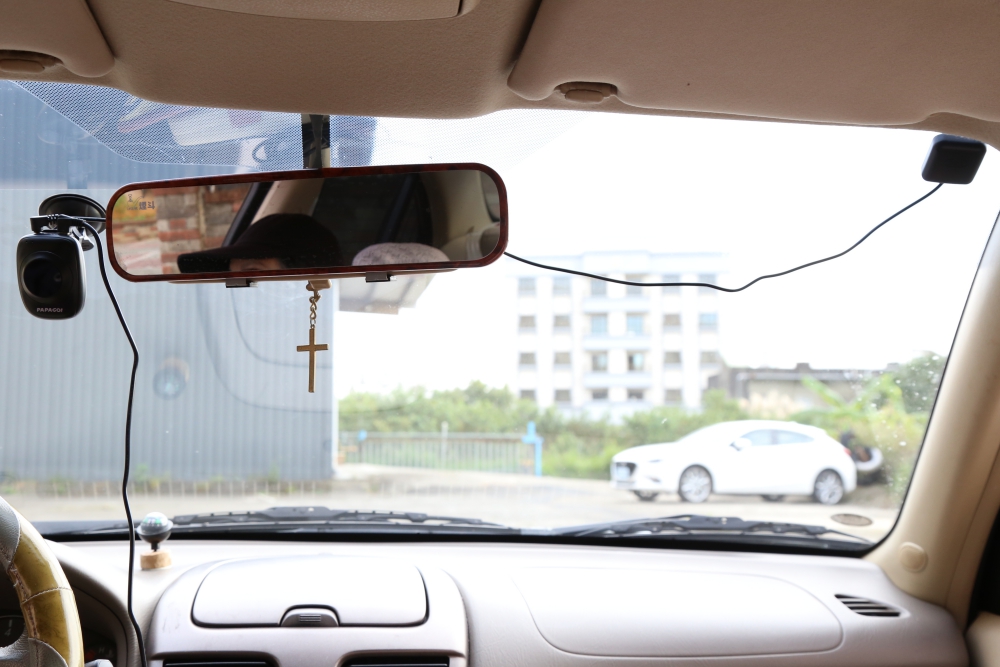 主機安裝位置架設於後視鏡左邊,以鏡頭能對到駕駛人臉部為主,GPS 天線則黏貼於右上角擋風玻璃處。