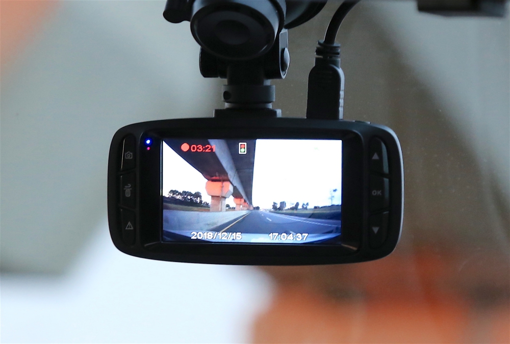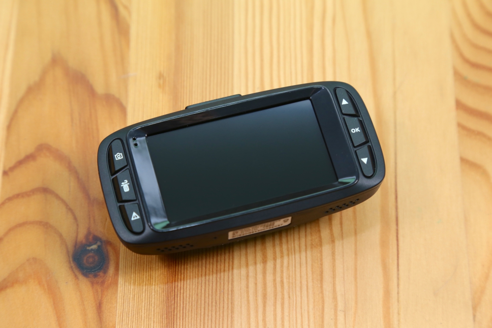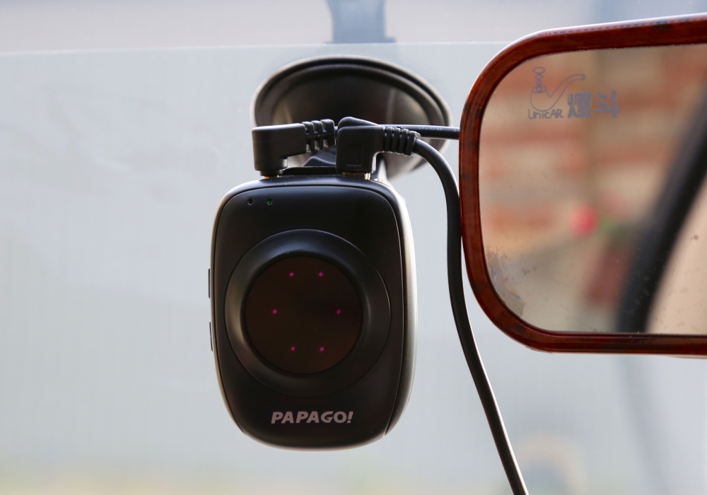 將支架滑入主機上的支架卡扣,在靠近車內後視鏡附近位置,將支架固定在前擋風玻璃。主螢幕左邊 LED 指示燈一顆是藍燈,恆亮時代表充電中,紅燈閃爍,同時開始讀秒時,代表處於錄影狀態。