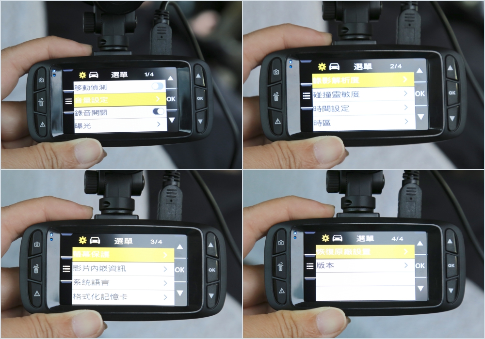 上路之前,建議先將所需的設定預先調整好,如下圖,內建的設定項目有:移動偵測、音量設定、錄音開關、曝光值、錄影解析度、碰撞靈敏度、時間設定、時區、螢幕保護、影片內崁資訊、系統語言、格式化記憶卡。