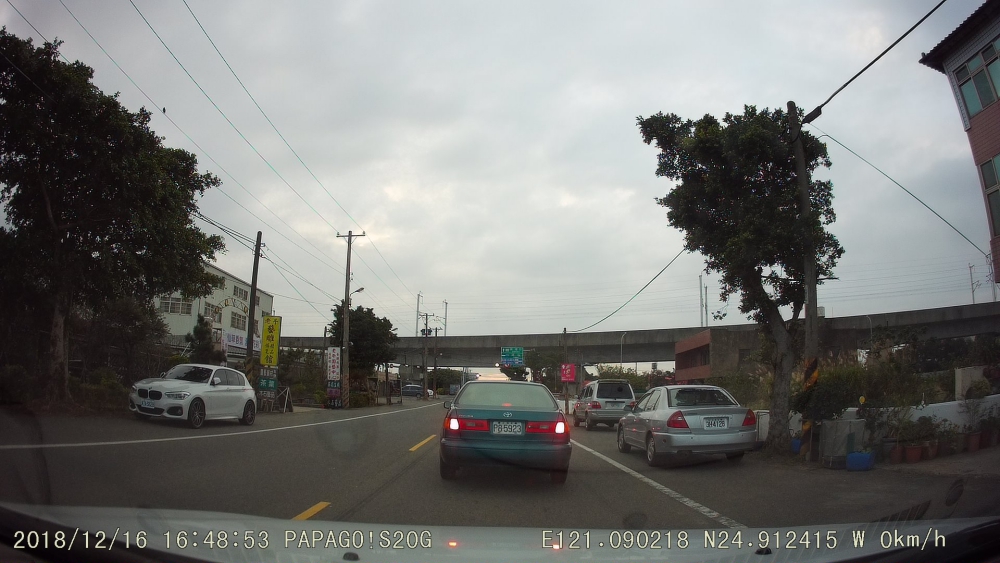 在拍照時是陰天,陰天狀態下,雲層的明暗層次有拍出,135度廣角鏡頭拍得到雙向車道,直達道路邊緣,以行車紀錄器的攝影影像能符合大部分情境要求。