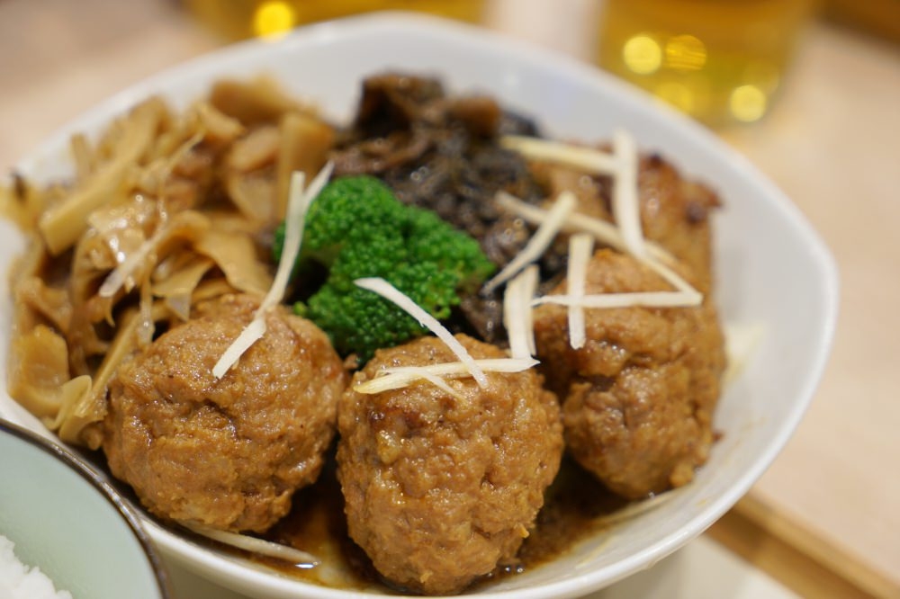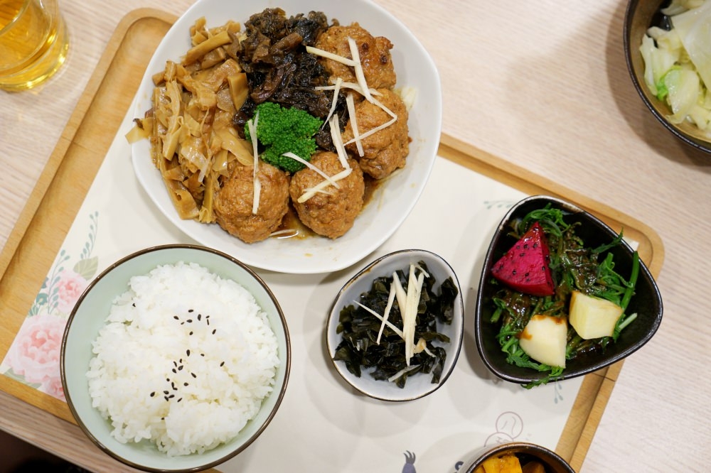 我吃的是大坪梅干菜獅子頭,豬絞肉加入梅干菜手工拍打揉捏製作而成,口味香鹹下飯。一份有四顆飽滿厚實的獅子頭,搭配梅干菜、筍乾,底部還有高麗菜,十分豐盛。