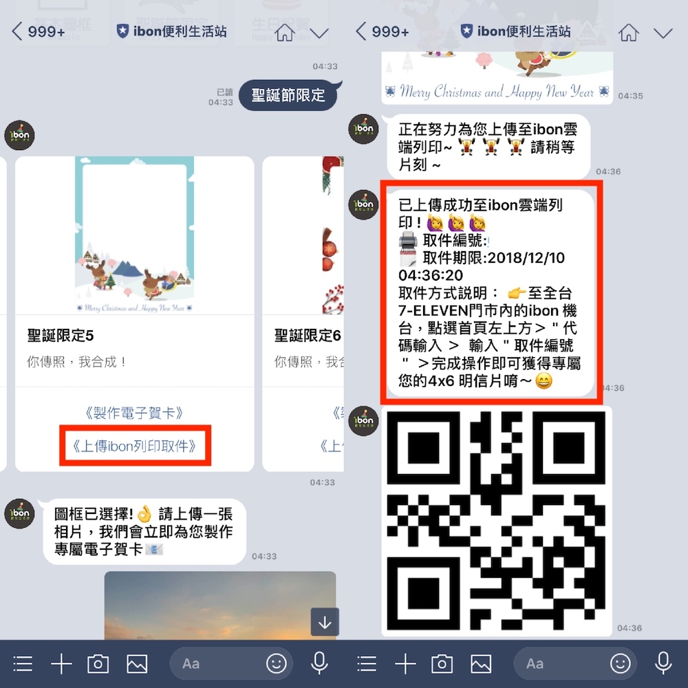 確認賀卡圖片沒問題後,請回到選擇聖誕圖框的對話內容,點選所選圖框中的「上傳 ibon 列印取件」,這時「ibon 便利生活站」就會將已製作完成的電子賀卡檔案上傳至雲端空間中,並提供用戶取件編號、期限、方式說明以及取件用的 QR Code,待收到完整的取件資訊後就可以到附近的 7-11 將個人化的聖誕賀卡免費印出囉!
