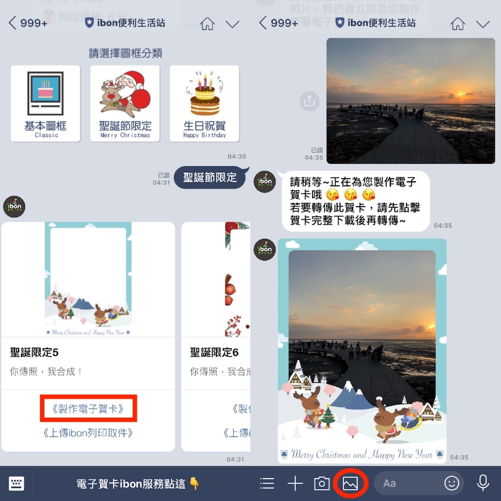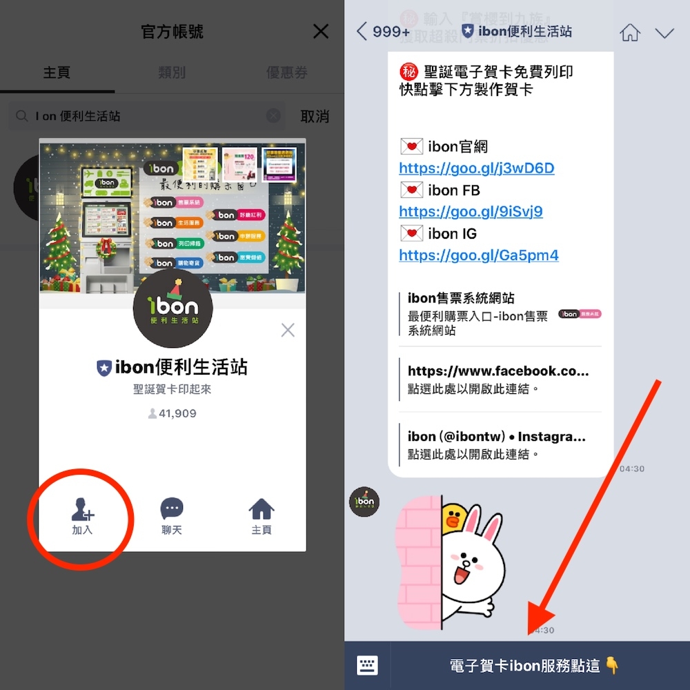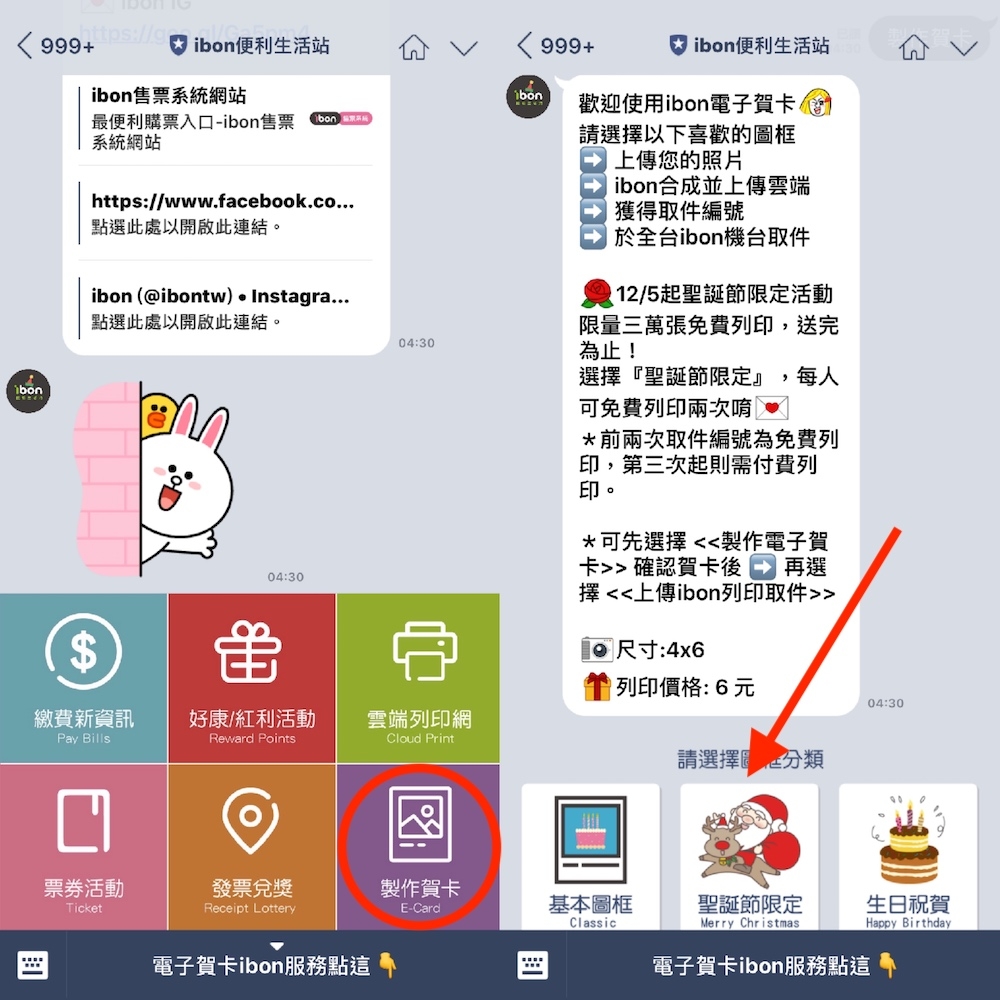 欲將想列印照片上傳至雲端空間,並前往 7-11 利用 ibon 列印成聖誕賀卡前,首先,請先加入「ibon 便利生活站」Line@ 生活圈,加入後直接點選最下方的「電子賀卡 ibon 服務點這」。