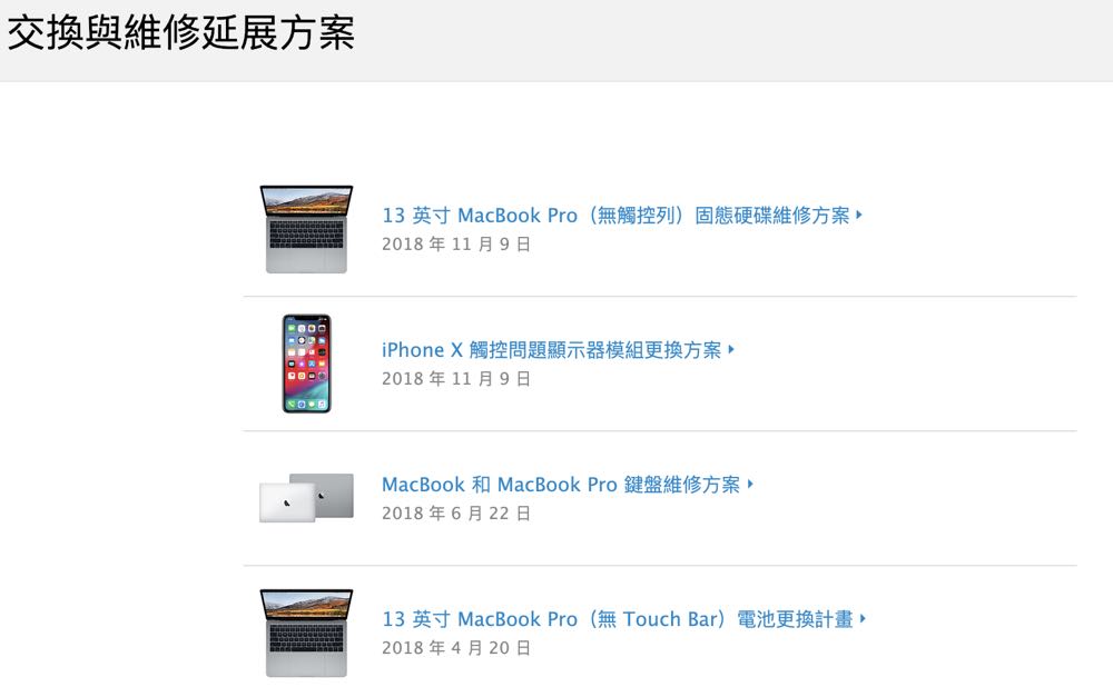 目前 Apple 正在進行的更換方案有「13 英寸 MacBook Pro(無觸控列)固態硬碟維修方案」、「iPhone X 觸控問題顯示器模組更換方案」、「MacBook 和 MacBook Pro 鍵盤維修方案」與「13 英寸 MacBook Pro(無 Touch Bar)電池更換計畫」,不過這些計劃的時效性都不如電池更換來的緊迫,因此建議先等 12 月 31 日電池更換計劃結束後,再進行預約或許會來的容易點。