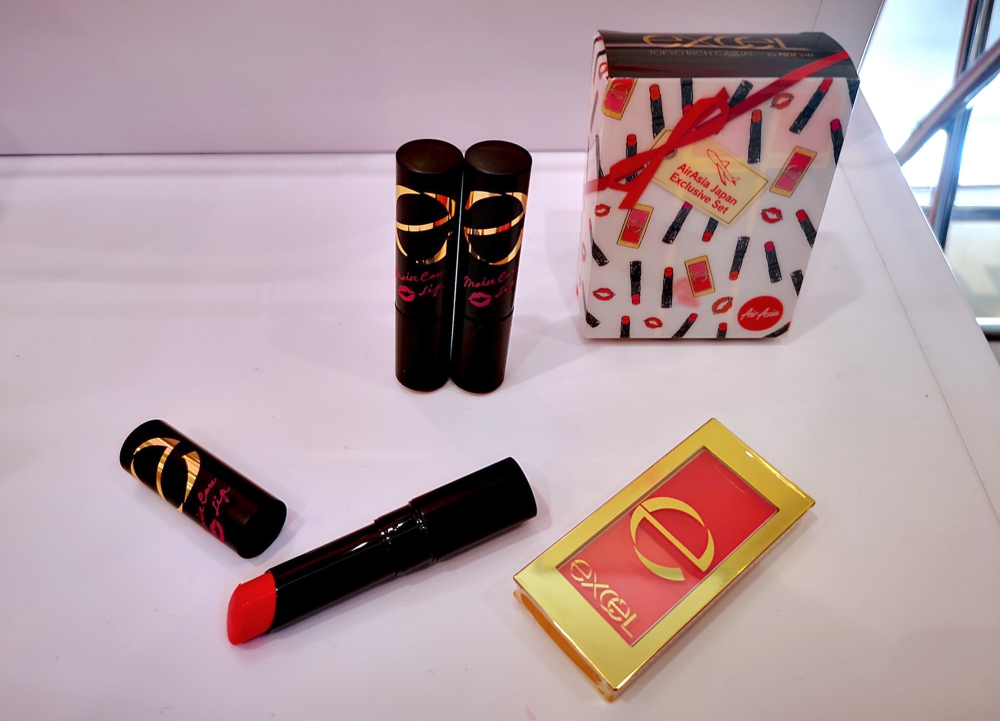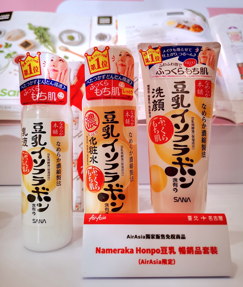 機上免稅品獨家販售 Excel 口紅三支裝與眼影套裝組合,以及 Nameraka Honpo 豆乳暢銷品套裝,皆是在台灣受歡迎人氣品牌。