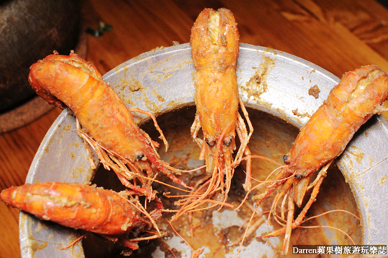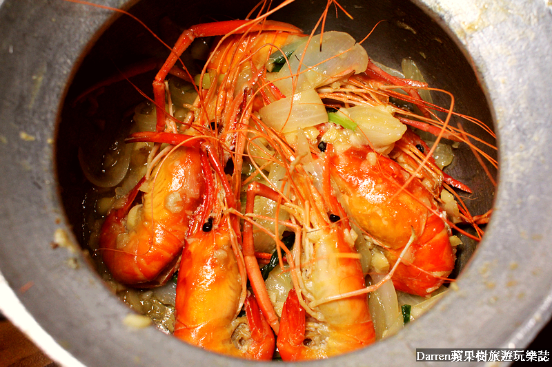 來吃活蝦料理少不了要點胡椒蝦,店家是連鋁製專用甕一起上桌,活蝦煮熟在鋁甕翻攪悶到入味,讓胡椒鹽依附在蝦殼上面,一品活蝦的胡椒蝦料理是使用數十幾種藥材,搭配上店家特調比例的胡椒粉,充滿香氣而不會那麼嗆辣。