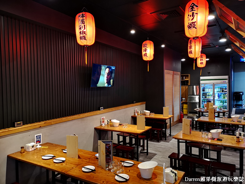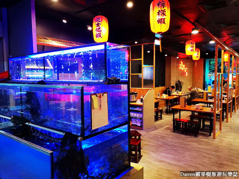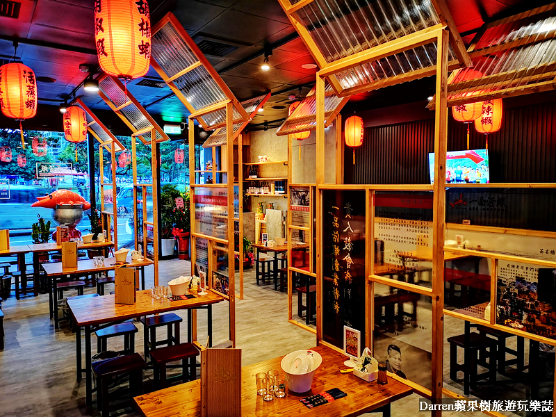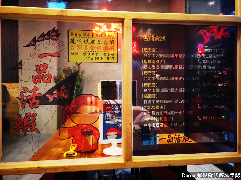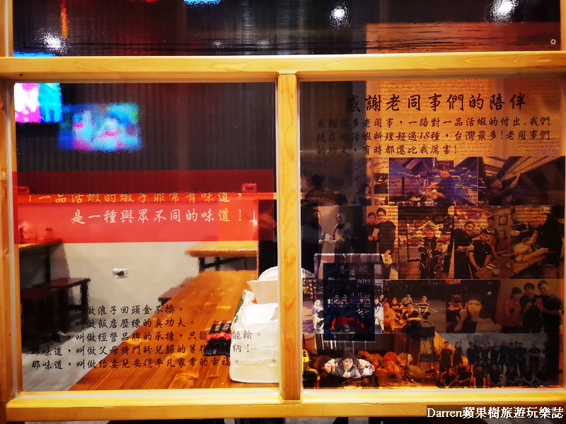 店內用餐裝潢很促咪,除了大紅燈籠高高掛之外,走道兩側就像木頭搭建的攤子,有種早期路邊台式居酒屋的FU,中間的走道則是一品故事廊道,有著一品活蝦從2003年開始創業到現在的點點滴滴,不妨可以停下腳步看看故事。