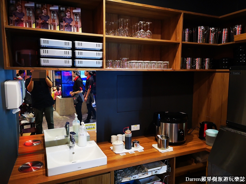 店內設有洗手檯讓客人剝完蝦殼後方便洗手,調味料區有醬油、辣椒等,不過這兒的料理幾乎都有調味所以都沒用到,米飯是自取無限供應,想吃就過來自己加飯,入坐前桌上都擺設好餐具、杯子、垃圾桶等,用餐空間整齊乾淨。