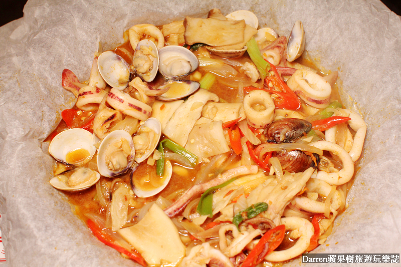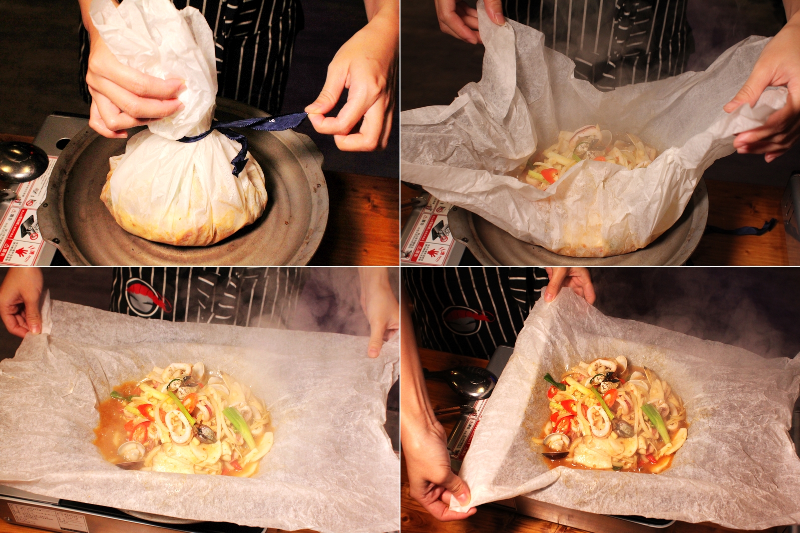 福袋蛤蜊中卷上桌就像一個福袋綁起來,就像是紙火鍋的概念裡頭有來自澎湖的中捲以及飽滿的蛤蜊包在其中。