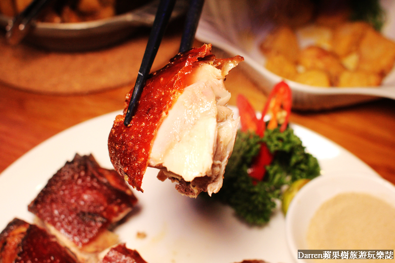 當日限量脆皮雞,聽到當日限量就好比期間限定道理相同,一聽到就點下去了,這脆皮雞外表是油油亮亮好吃樣,選用中部仿仔雞腿,透過多道繁瑣料理手續,使熱油反覆澆淋才能成就脆皮雞,雞皮真得是脆到會卡滋一聲超扯!