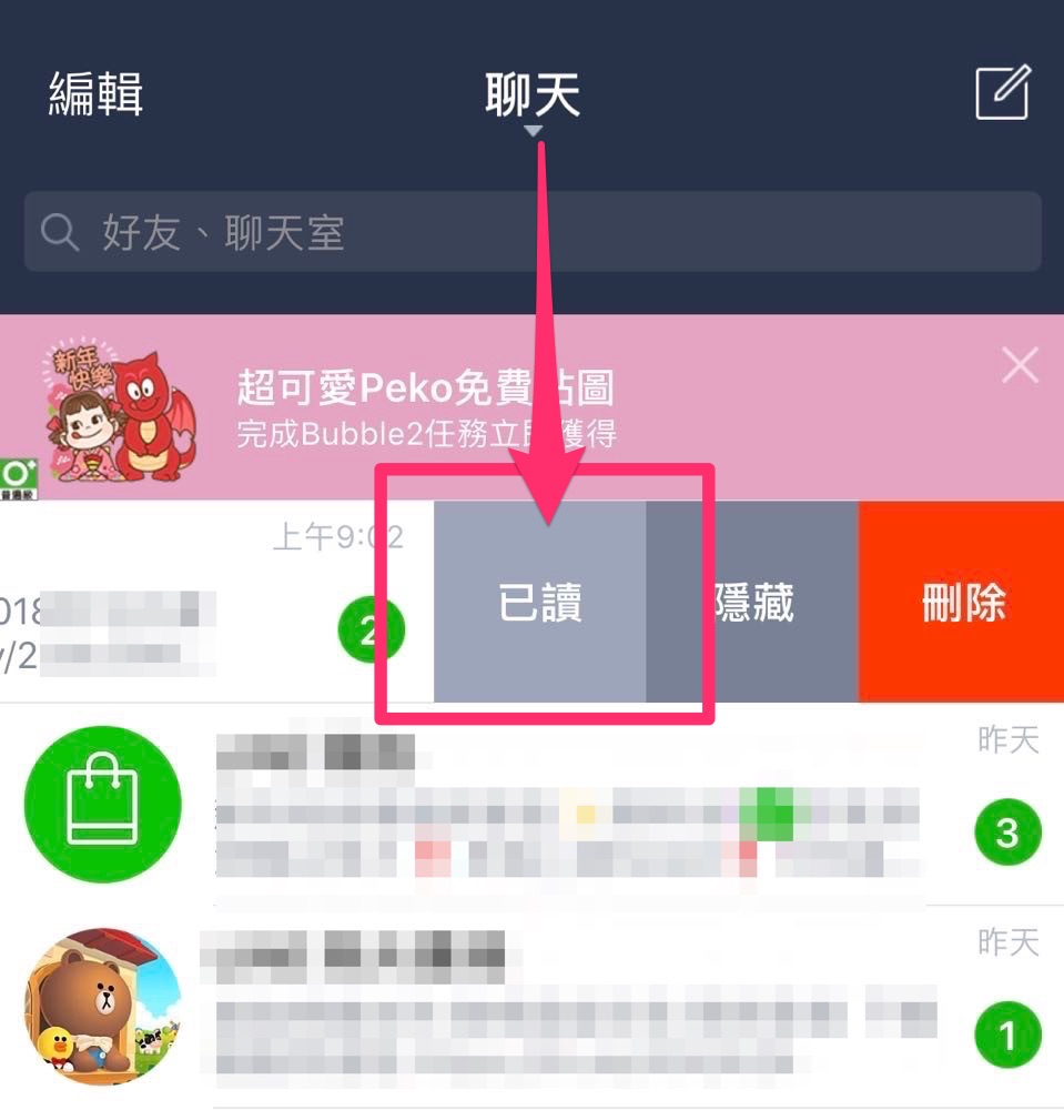 - 接著滑開每則未讀訊息便能選擇「已讀」來讓未讀訊息符號消失。
