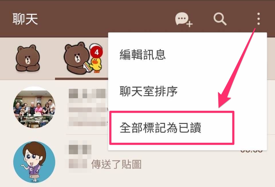 也和桌機版大同小異,同樣在聊天首頁中右上方看見直式三點更多選項的符號,點下後選擇「全部標記為已讀」。