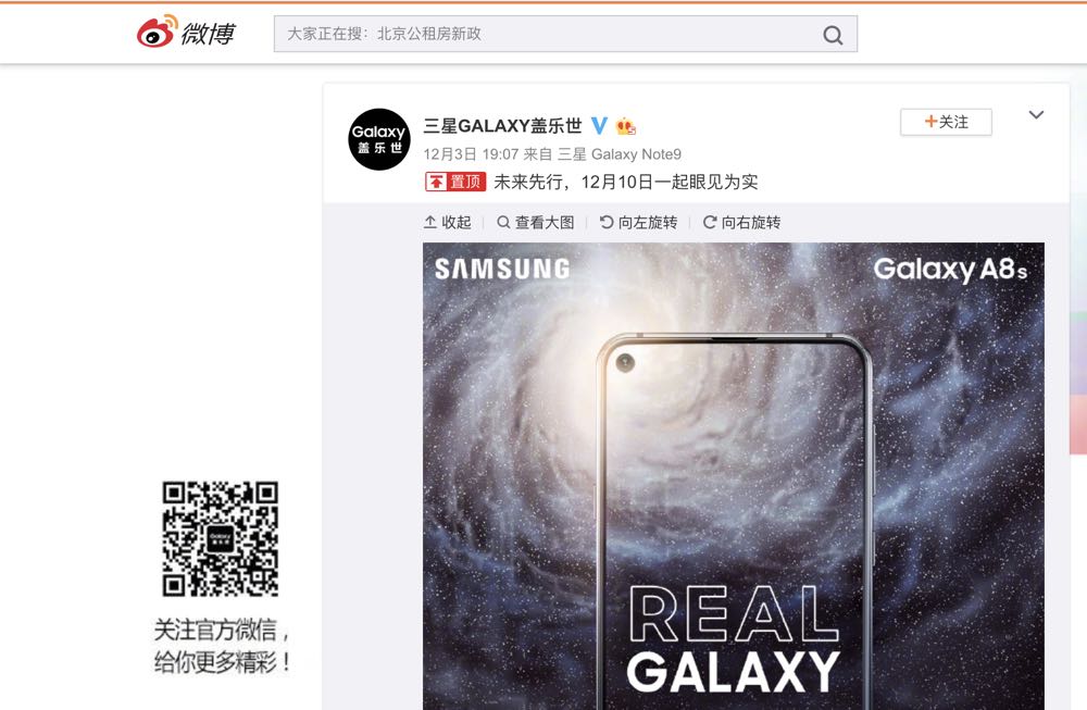 2019 年的手機會不會有 5G、會不會開始折疊或許還不能確定,不過現在看來,「挖孔」或許會率先成為一種潮流了呢!就在稍早三星中國官方在微博上放出一張「未來先行,12 月 10 日一起眼見為實」的 Galaxy A8s 發表會預告圖,除了宣布將在 12 月 10 日於北京發表,還有那開在左上方的小鏡頭孔外型!