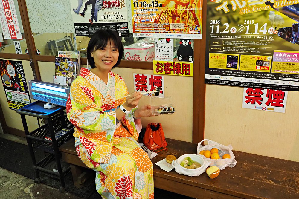 在裡頭找到了一個提供給客人使用的座位區,就在此開動了!這一餐花了1000日元,內容有關東煮:高麗菜150、豆腐130;橘子 200;栗子紅豆餅150;蛋蛋麵包100、壽司 370。