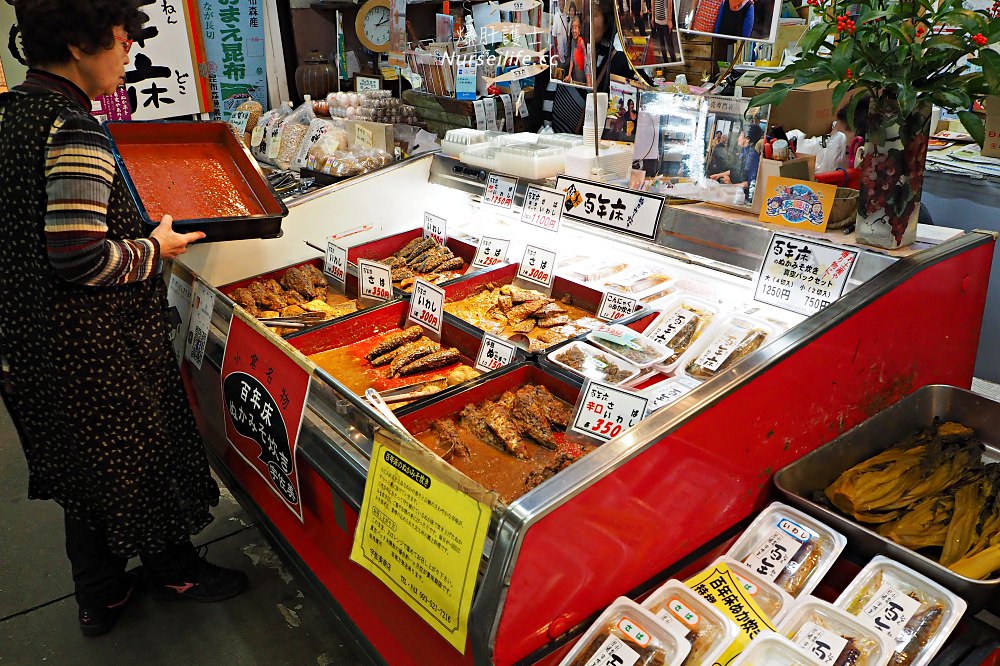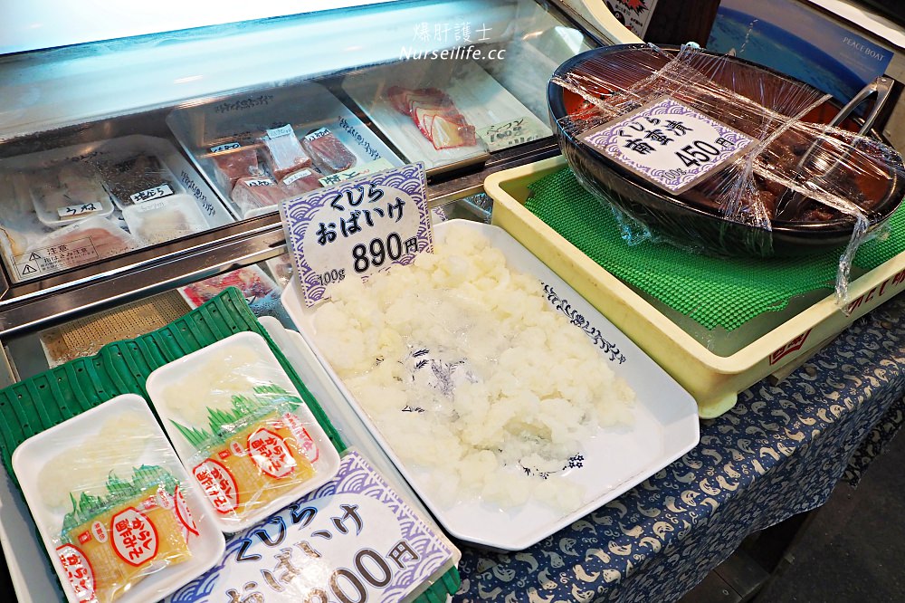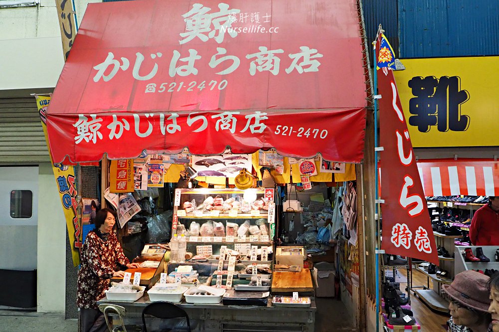 一條長約400公尺的街道是主要的美食區域,往裡面複雜的小通路也有生鮮魚販及雜貨店等,而這裡也有販賣「鯨魚」肉,大家可能會說那個肉能吃嗎?在旅行途中,爆肝會選擇尊重當地文化,不愛的跳過就好了,但不需要對當地所販賣的物品有太大的反應,而為何會有吃鯨魚的傳統?主要在明治時代前,日本是不吃肉的,吃魚但是不吃牛肉等肉品,也就是和牛那些都是明治維新為了強化日本人的體格才發展出來的,因此在繩文時代開始一直都有吃鯨魚肉的記載,在室町時代(1336 年 – 1573 年)最高級的魚料理就是鯨魚,第二名則是鯉魚,甚至在戰國時期,鯨魚也是被當成高級供品的一種。