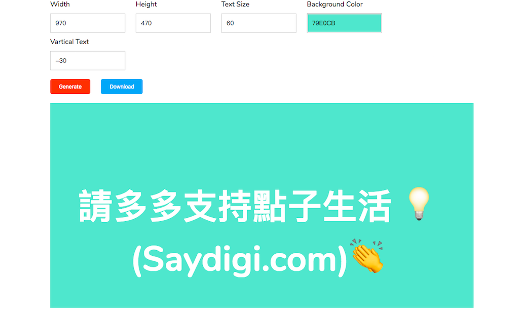 只要進入「Thumbnaily 文字圖檔產生器」網頁,就能看見所有的步驟都在上面,包括有想要顯示的文字、圖案的尺寸、文字大小、底色顏色以及文字與上下邊的距離,這時候我們要做的便是- 輸入欄位中想要的數字。