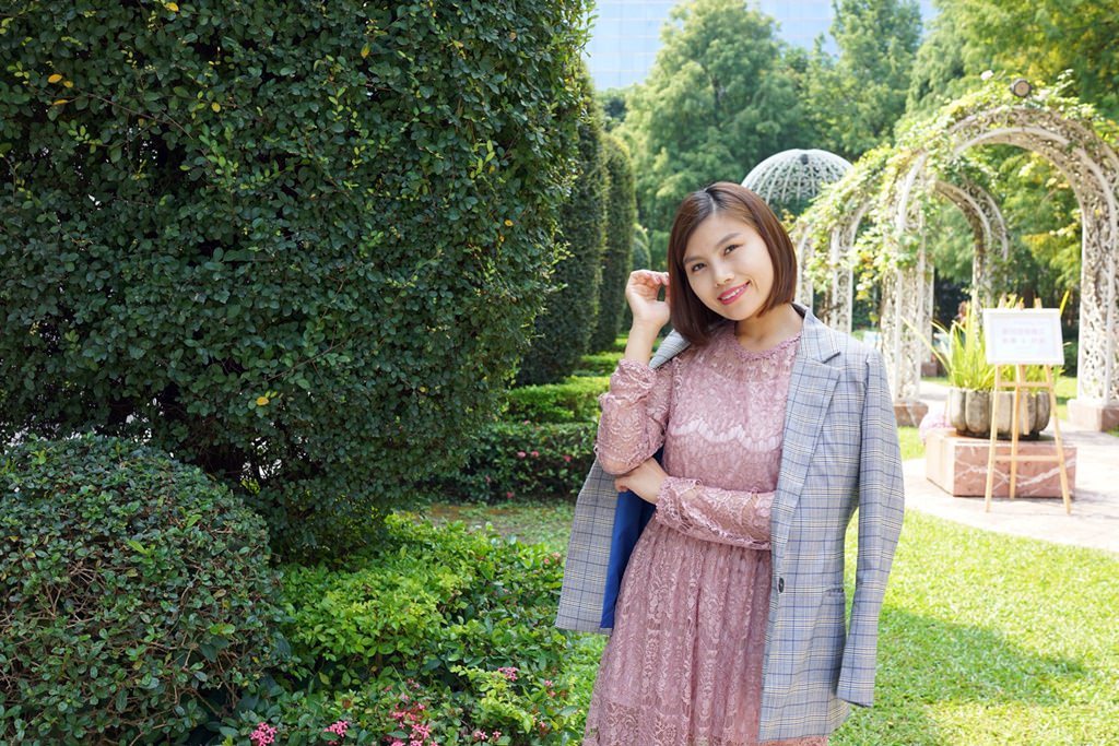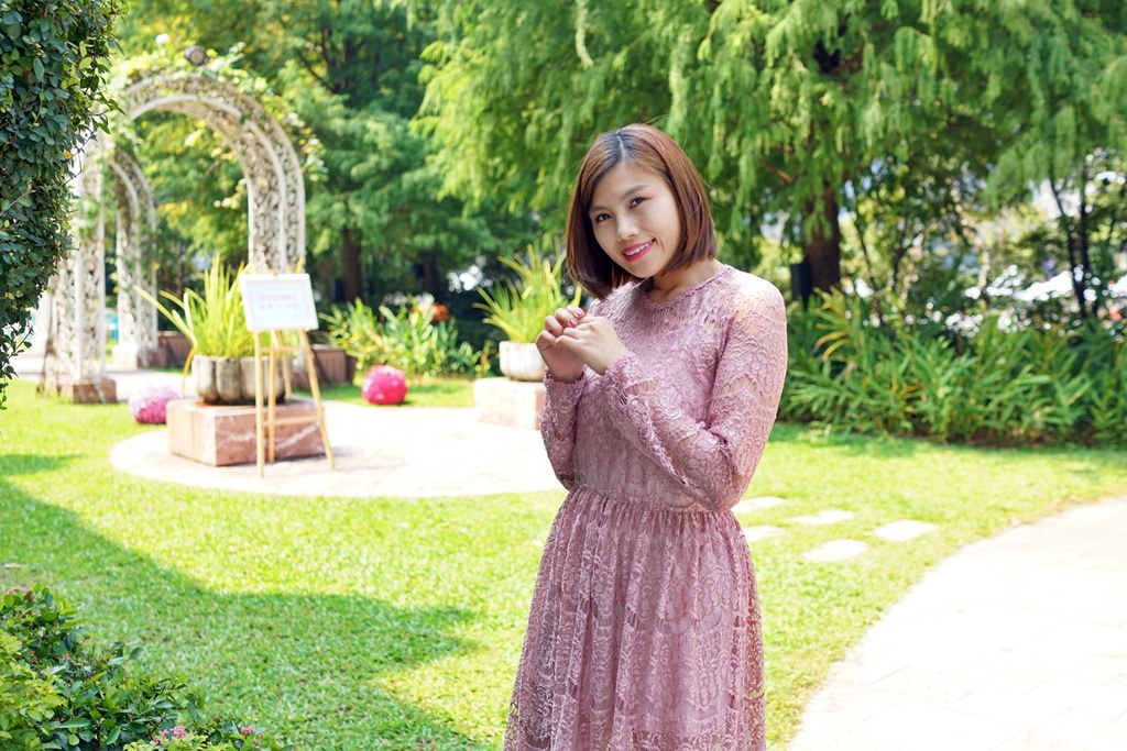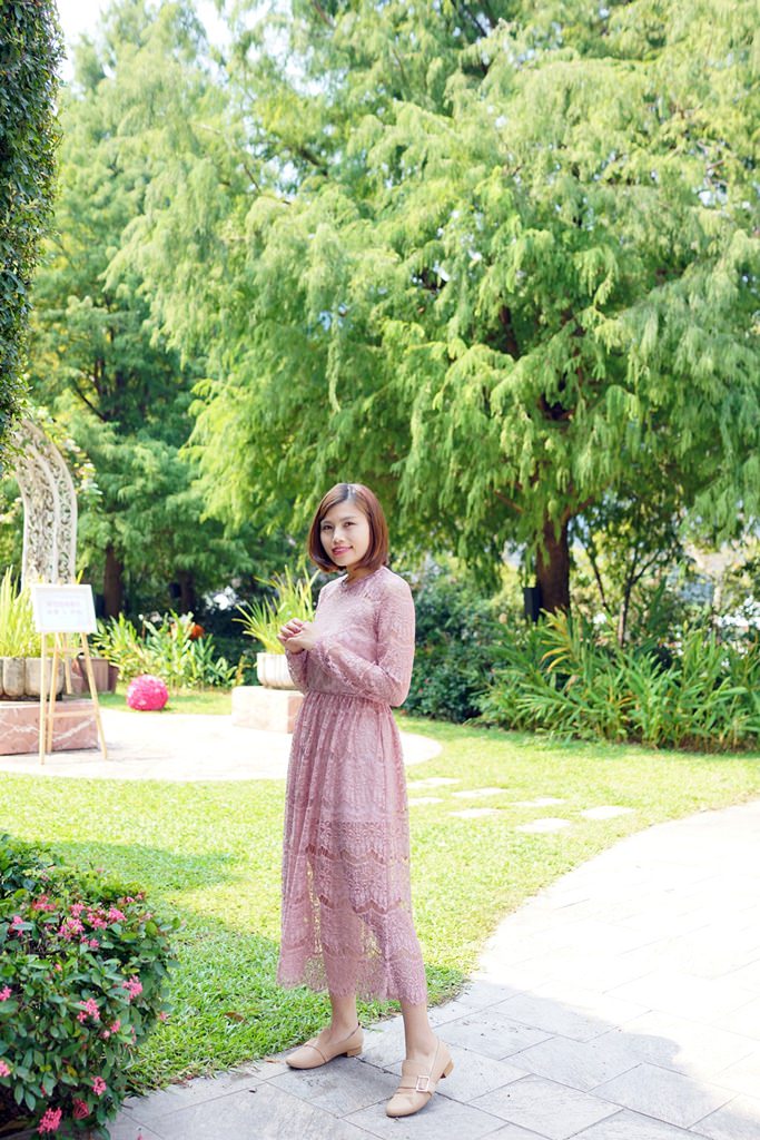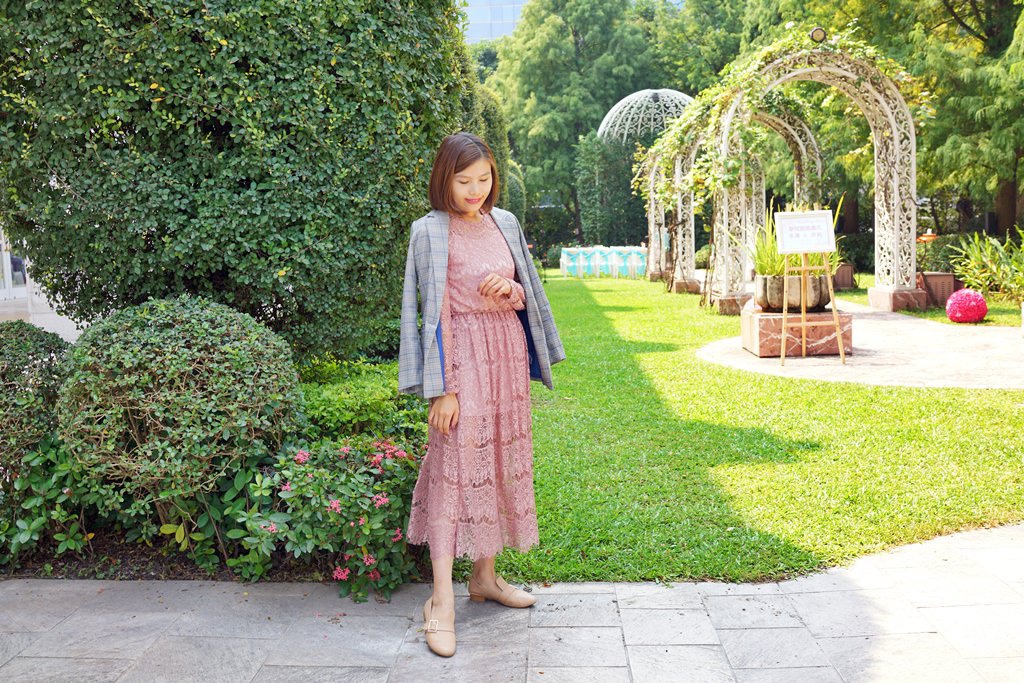 最後一套又回歸粉紅色囉,選了一件式的蕾絲洋裝,這天是去參加FIFI的婚禮,因為他們有戶外證婚儀式,像這樣看起來溫柔有氣質又會輕飄飄的洋裝就很合適,如果天氣比較冷,可以外搭一件西裝外套或大衣都可。