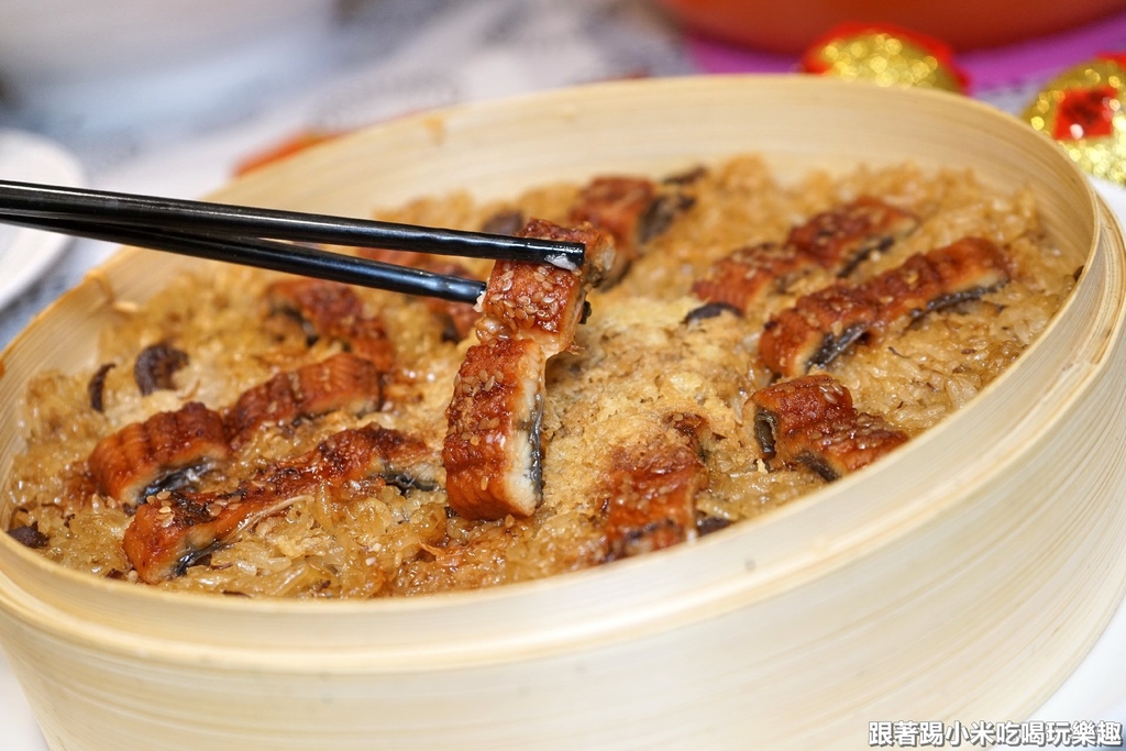 蒲燒鰻是選用選用肉質細緻、出口日本的高級鰻魚,有甜甜的醬燒口味,以宅配年菜來說算很不錯了,而米糕有軟Q入味口感,意外的讓我們覺得好吃,這盤可是今晚最快被清光的一道