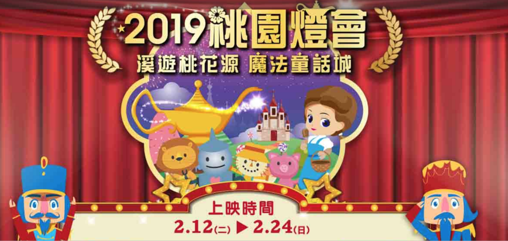 2019桃園燈會沿著8公里長的南崁溪水岸設置璀璨燈飾,以「童話」為主題進行4大燈區設計,共計設置超過40組以上的特色燈組,以「童話」為主題打造4大燈區,包含阿拉丁神燈、綠野仙蹤、胡桃鉗及愛麗絲夢遊仙境等著名元素,更結合童話故事與桃園各項建設製作花燈,以童話的美好呈現桃園各項發展及建設。