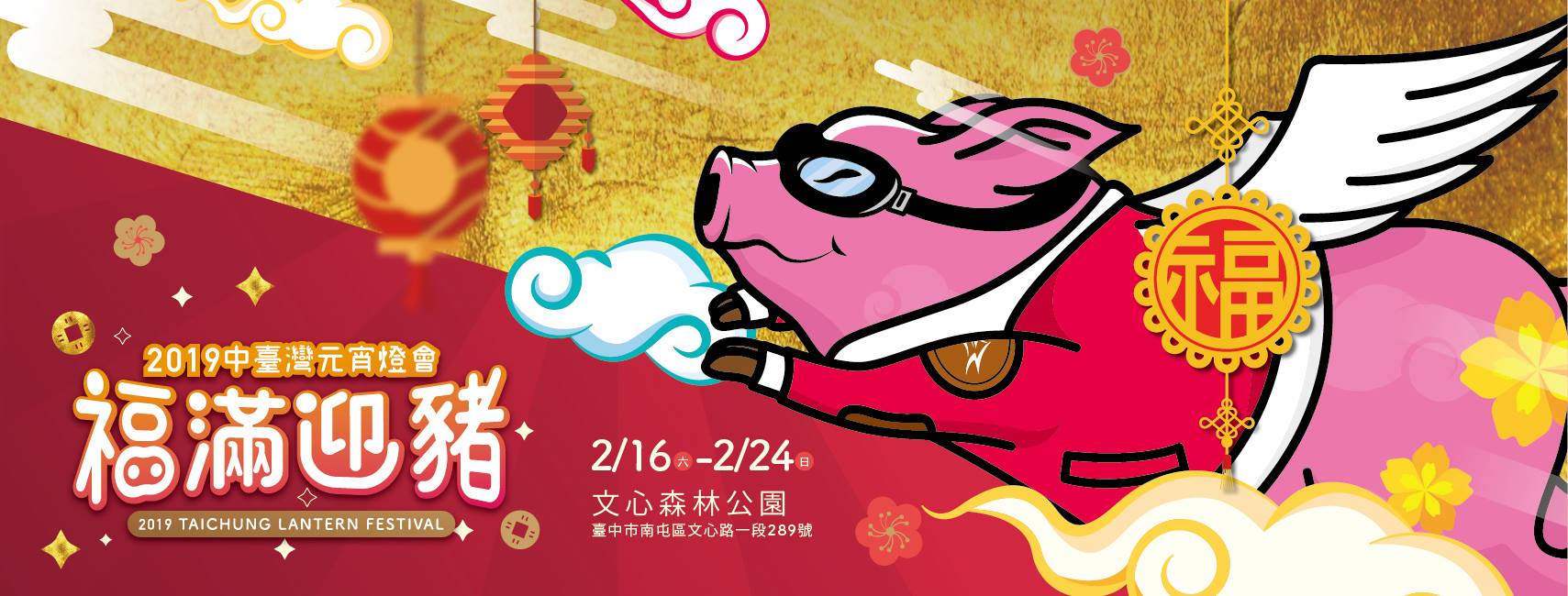 2019適逢豬年,台中燈會主燈「御天飛行豬」以傳統圓滿外型,意寓臺中富足民安之外,還增添生動的元素,插上翅膀、披上風衣,一飛衝天,承載著市民對於潔淨藍天的渴望,恣意翱翔天際;更同時象徵臺中積極飛向國際,築夢經濟躍進的大無畏精神。