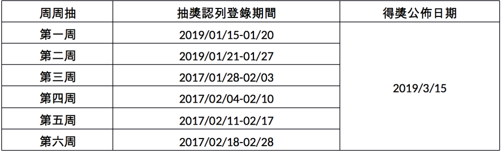 *每周獎項統一於活動結束後抽出,並於2019/03/15公布。