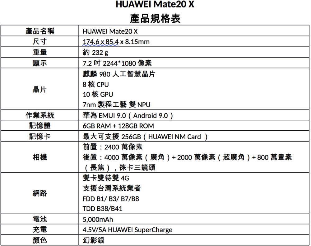 HUAWEI Mate20系列堪稱華為在智慧手機領域集大成之作品,搭載華為史上最強大的7奈米製程麒麟980 AI晶片,在攝影方面配置全新徠卡矩陣式超廣角三鏡頭,一次滿足廣角、變焦、微距、夜拍及AI攝影等所有攝影需求,更搭載大電池提供強勁續航,融合所有消費者對智慧型手機的需求,打造出效能、攝影、續航及AI智慧各方面皆無懈可及的頂尖年度旗艦機!HUAWEI Mate20系列在台銷售更是有著亮眼佳績,好評不斷。1月19日起,再推出大屏幕最強旗艦HUAWEI Mate20 X,並於全省三家體驗店舉行首賣排隊活動,提供台灣消費者更多元的選擇。HUAWEI Mate20 X主打7.2吋超大珍珠屏設計,搭載5,000mAh超大電量提供更強續航,無須擔心電力耗損,隨時隨地保持完美狀態,透過創新石墨烯材質均勻散熱,帶來更穩定及流暢的使用體驗。HUAWEI Mate20 X自1月19日起在台上市,建議售價NTD 22,900。