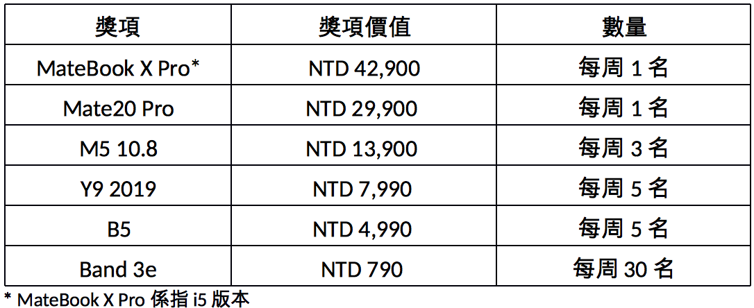 *活動產品型號包括:Mate20 X / Mate20 Pro / Mate20 / nova 3 / nova 3i / Y9 2019 / Y7 Prime 2018 / Y6 2018 / P20 Pro / P20 / Y7s / Mediapad M5 10.8 / Mediapad M5 8.4 / Mediapad M5 Lite 10.1/ MediaPad T5 10 / Matebook X Pro i7 / Matebook X Pro i5 /Matebook X /Matebook E.