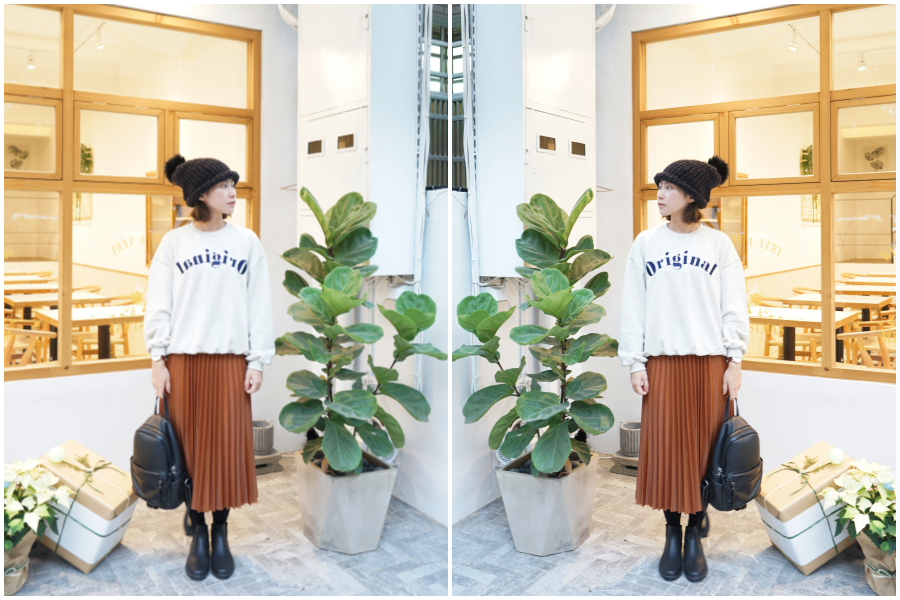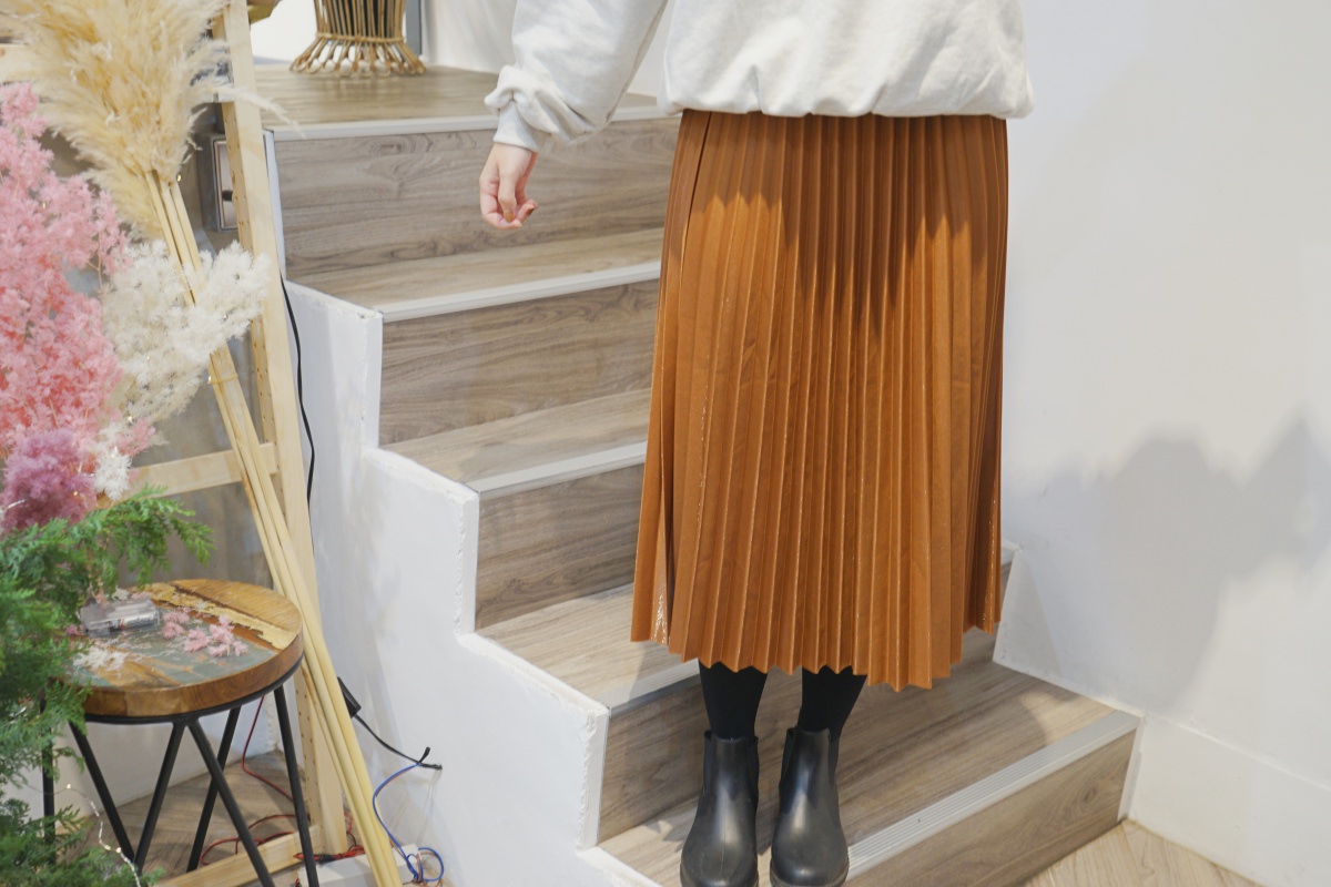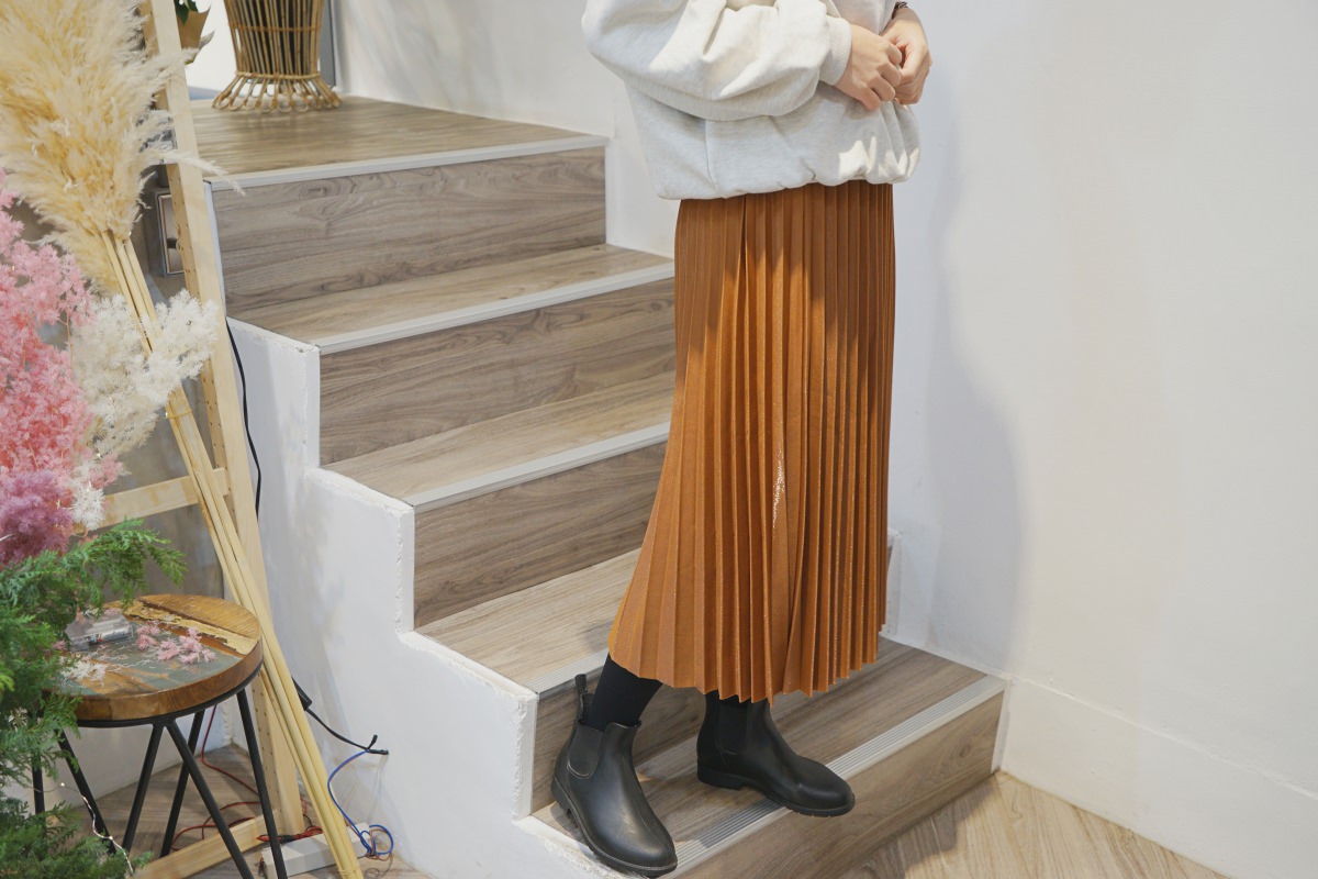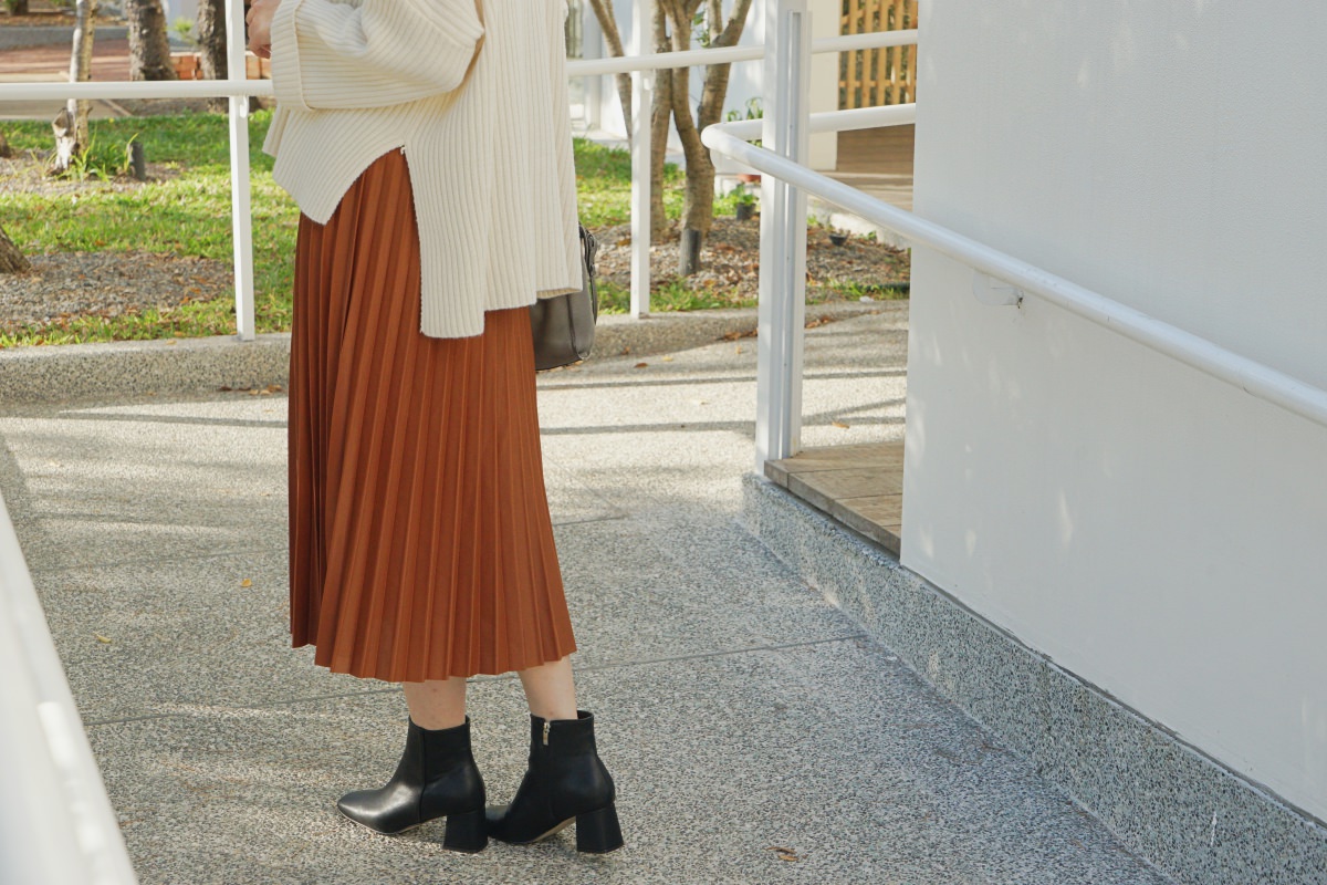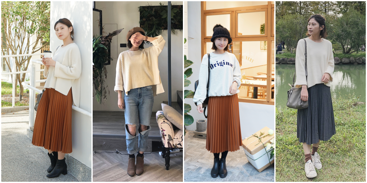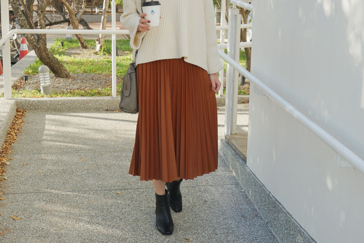 這次挑選的咖色百摺是我衣櫃裡沒有的顏色,實在太可愛。喜歡這種焦糖咖,適合秋冬。上衣可以搭配前面介紹的大學T,也可以配毛衣、襯衫,都很好看,非常百搭。