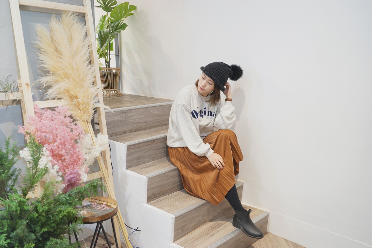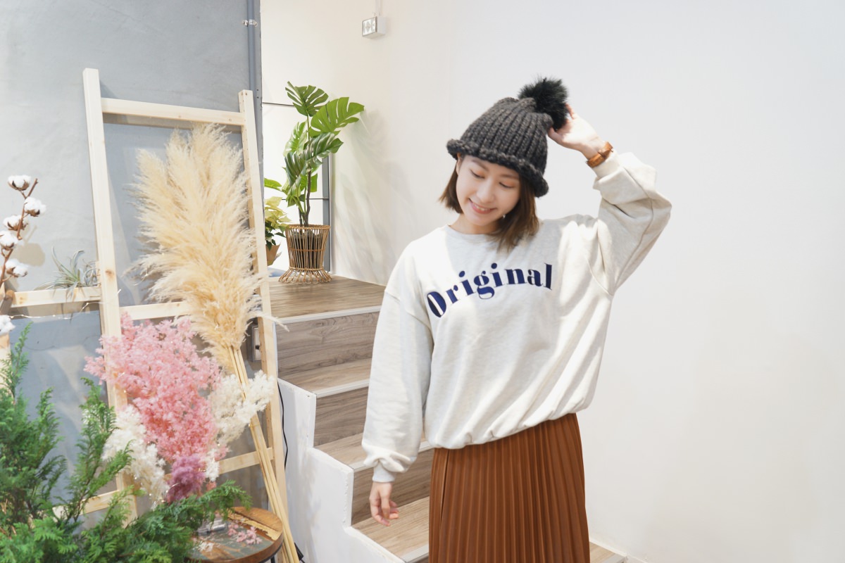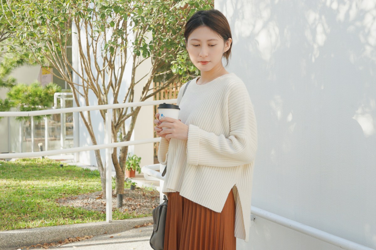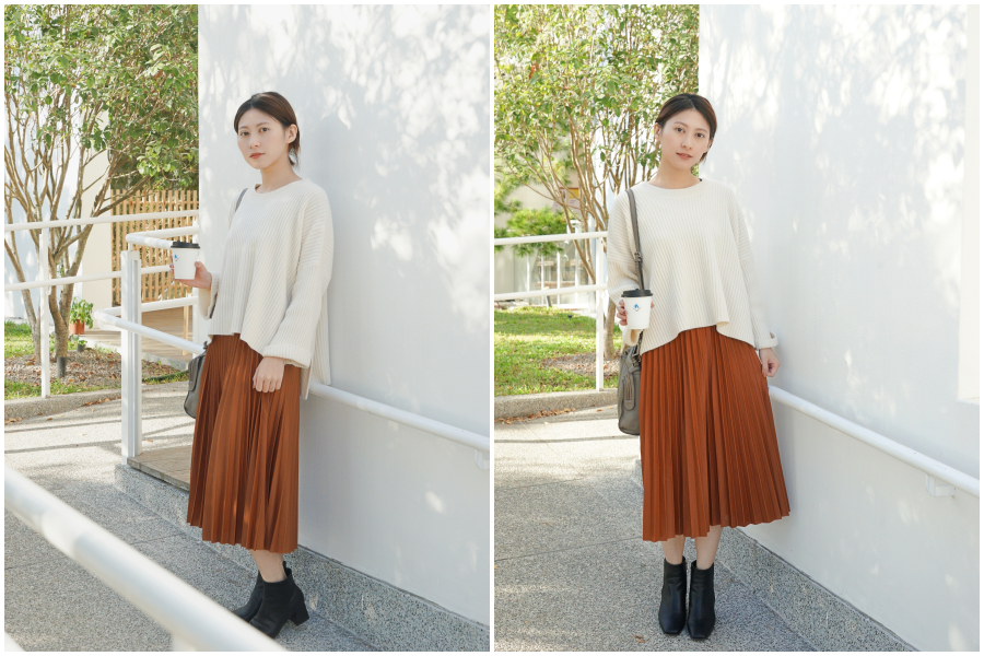 基本款的壓紋毛衣,我最常穿出門的米白色。質料柔軟親膚,有點厚度但不會太熱,前短後長的設計很修身。搭配前面的百摺長裙有女孩感,搭配基本的牛仔褲有個性。除了裙裝與褲裝,也可以利用鞋子來改變風格。一套穿搭可以利用不同質料的單品變換他原本的感覺,很有趣。