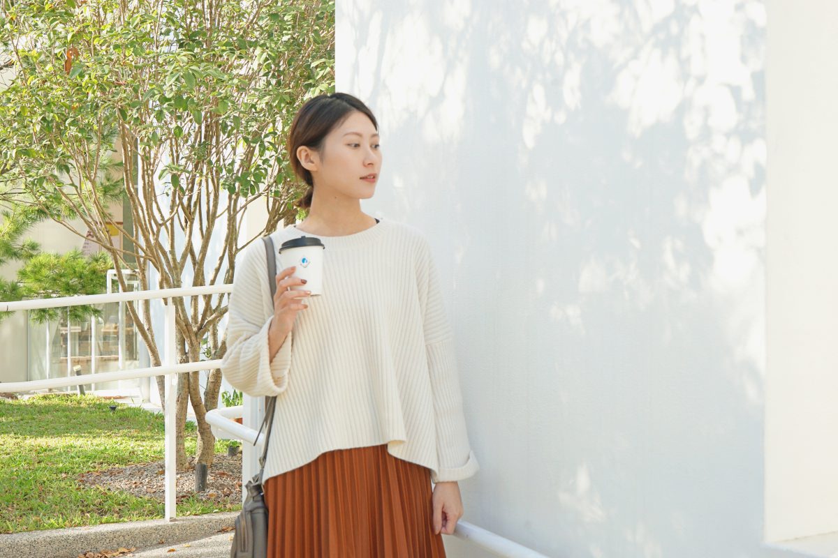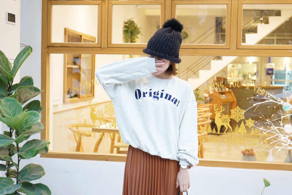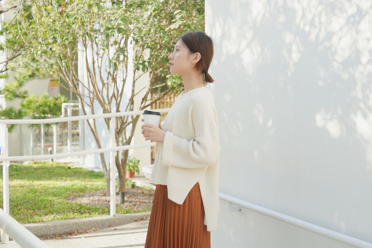 基本款的壓紋毛衣,我最常穿出門的米白色。質料柔軟親膚,有點厚度但不會太熱,前短後長的設計很修身。搭配前面的百摺長裙有女孩感,搭配基本的牛仔褲有個性。除了裙裝與褲裝,也可以利用鞋子來改變風格。一套穿搭可以利用不同質料的單品變換他原本的感覺,很有趣。