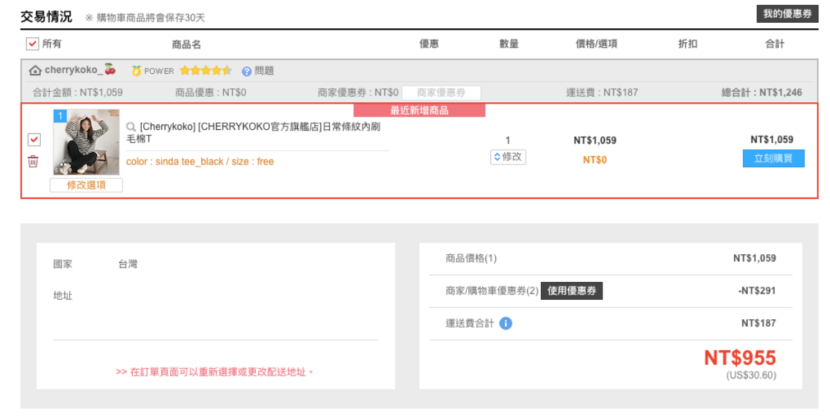舉個例子,這件Cherrykoko的條問上衣在這裡購入是原本是1246元,但是使用優惠券+免運補助券,可以折價 291 元,現省近三百塊!利用優質的購物網站,用最省錢的方式買到喜歡的商品,這就是購物的小確幸啊!