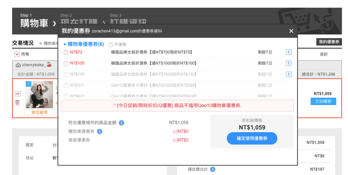 這裡比較特別的是,免運優惠券不會全部折抵,因為他免運的是免國際運費,國內的運費還是會計算進去,因此價格不一定。領取優惠券以後,結帳時記得到「我的優惠券」使用,才會有優惠。