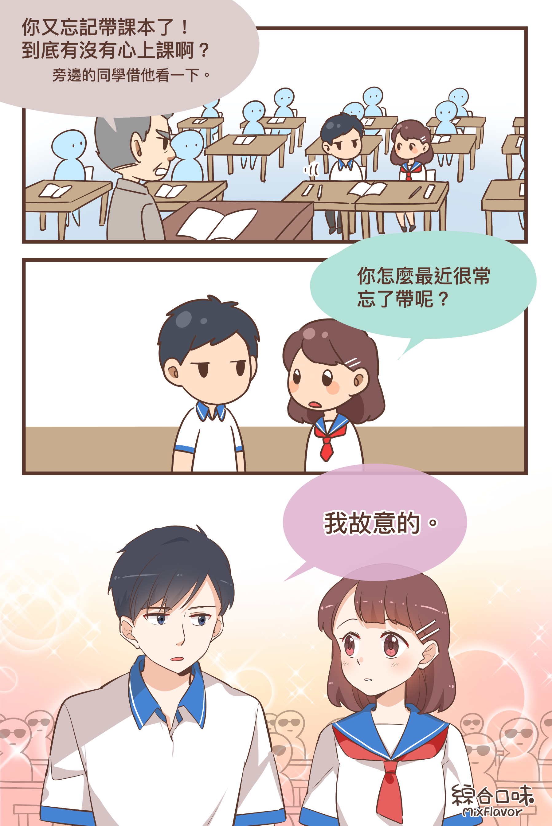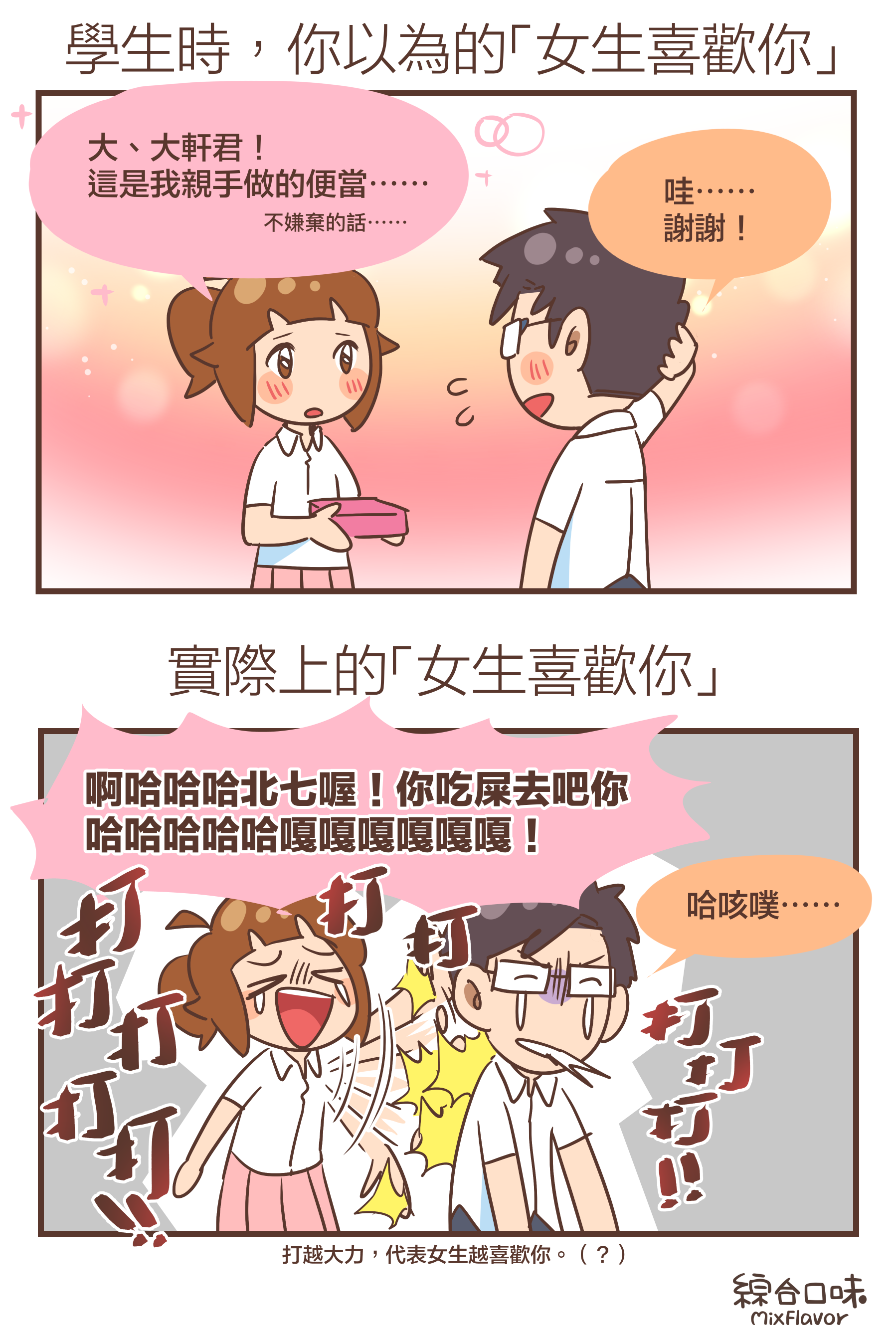 綜合口味 2019/01/14瀏覽: views 還記得學生時的青澀嗎?那時候的小男生都不知道從哪裡學的撩妹手法,各個高明啊!而且有的還會十八般武藝,打籃球、彈樂器、抓頭髮樣樣來!帥的小女生不要不要的,但是,聽說一旦女生們喜歡上男生,就會變成⋯⋯ 還有故意借筆、借外套⋯⋯等,最羞恥的是借便當盒蓋和餐具XDDD 對女生來說,初戀是甜蜜中帶點苦;對男生來說,初戀的感覺說不定是痛痛的⋯⋯(?) (雖然大軒說:「女生越瘋癲,男生越喜歡」⋯⋯真的假的啦?!) 原文刊登於:https://blog.mixflavor.com/2019/01/purpose.html Related Items好有趣 好有趣 2019/01/14瀏覽: views 綜合口味 喜歡以輕鬆治癒的畫風,將日常中的酸甜苦辣化為可愛有趣的故事!秉持著「世間沒有萌不起來的東西」信念,持續創作中! Related Items好有趣 next page