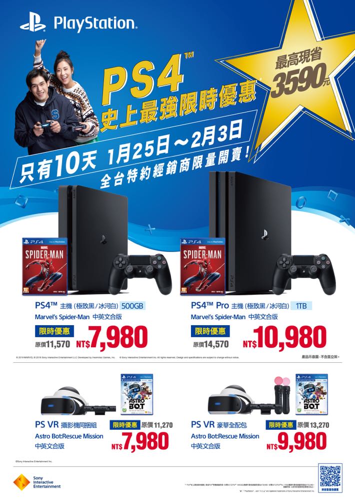 索尼娛樂 (SIET) 宣布,將自 1 月 25 日 (五) 起至 2 月 3 日 (日) 止將推出「PS4 史上最強限時優惠方案」。PlayStation 4 (PS4)、PlayStation 4 Pro (PS4 Pro) 將以超值優惠價格提供,並加贈 PS4 獨佔暢銷大作《Marvel’s Spider-Man》(中英文合版)」乙片。只有 10 天,於全台 PlayStation 特約經銷商限時限量販售!「2019 台北國際電玩展」期間 (1 月 25 日至 28 日) 的 PlayStation 攤位也推出此方案,現場更加碼再送「DUALSHOCK 4 無線控制器」乙支!