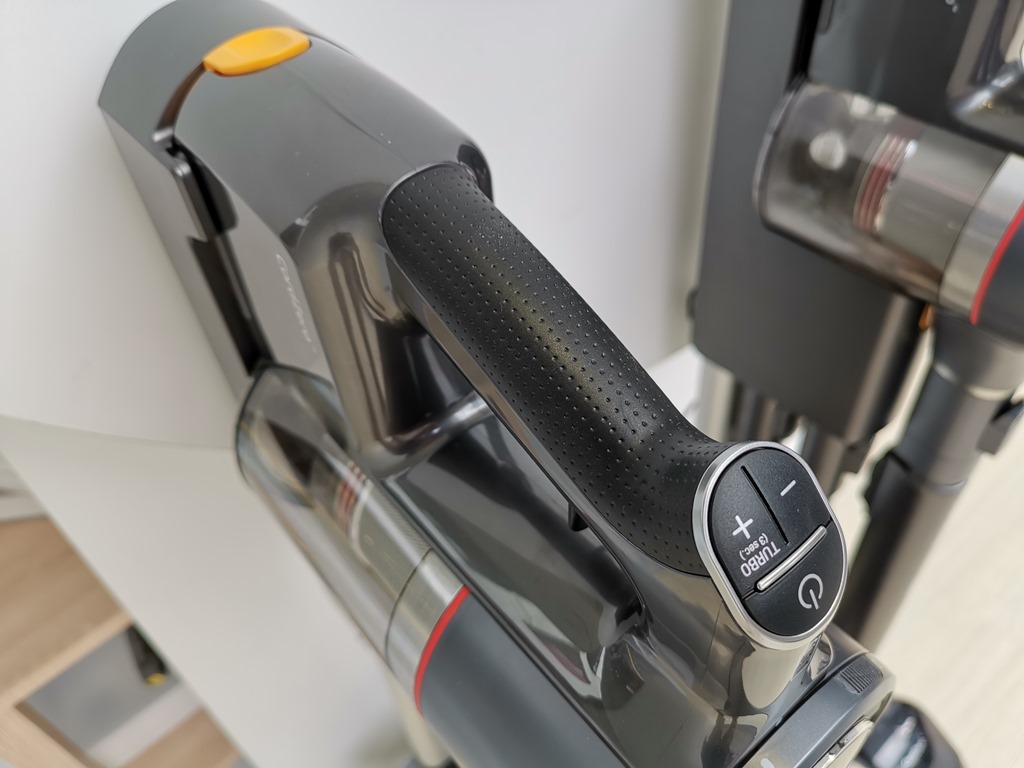 另外 One Touch 電源鍵也是非常方便的功能,除了按一下就可以開關與調整吸力外,不用一直按壓也是關鍵,不然一趟打掃下來,先痠痛的絕對不是腰背肩膀,而是你的手指頭。