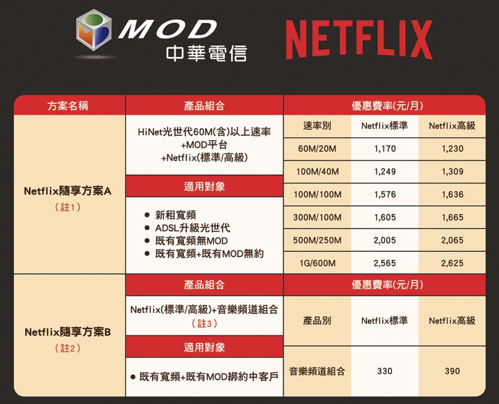 MOD x Netflix 的合作方案共分為 「Netflix 隨享方案 A」與「Netflix 隨享方案 B」兩種,約期都是一年,收費方式會依照網速、會員資格而有所不同。