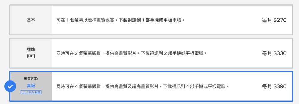 「Netflix 高級」則可以同時在 4 個裝置上收視,能夠支援播放 HD/4K 畫質影片。也就是說如果家中機上盒上正在收看 Netflix,同時還能夠於另外三個裝置 (手機 + 電腦 + 平板皆可) 使用相同 email 帳號登入。如果家中機上盒沒有在收看 Netflix,那麼就可以直接在其他四台裝置上同時登入收看。