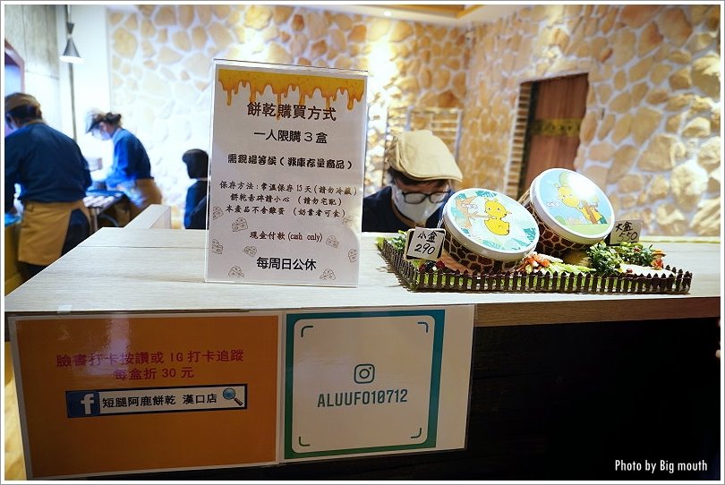 「短腿阿鹿」漢口店不僅店面更大,空間更寬敞,還有貼心的等候區,讓人排隊起來更加舒服啦~~且起司口味的曲奇餅更加討喜,不僅口感酥鬆香棉又帶點微微鹹香滋味,而且很容易讓人一口接一口停不下來啊~這時候只能暫時忘記熱量這回事,趁新鮮立馬吃完才是王道XD最近剛好快要過年了,有需要的朋友可以趕快來買幾盒當作年節伴手禮也很適合唷!