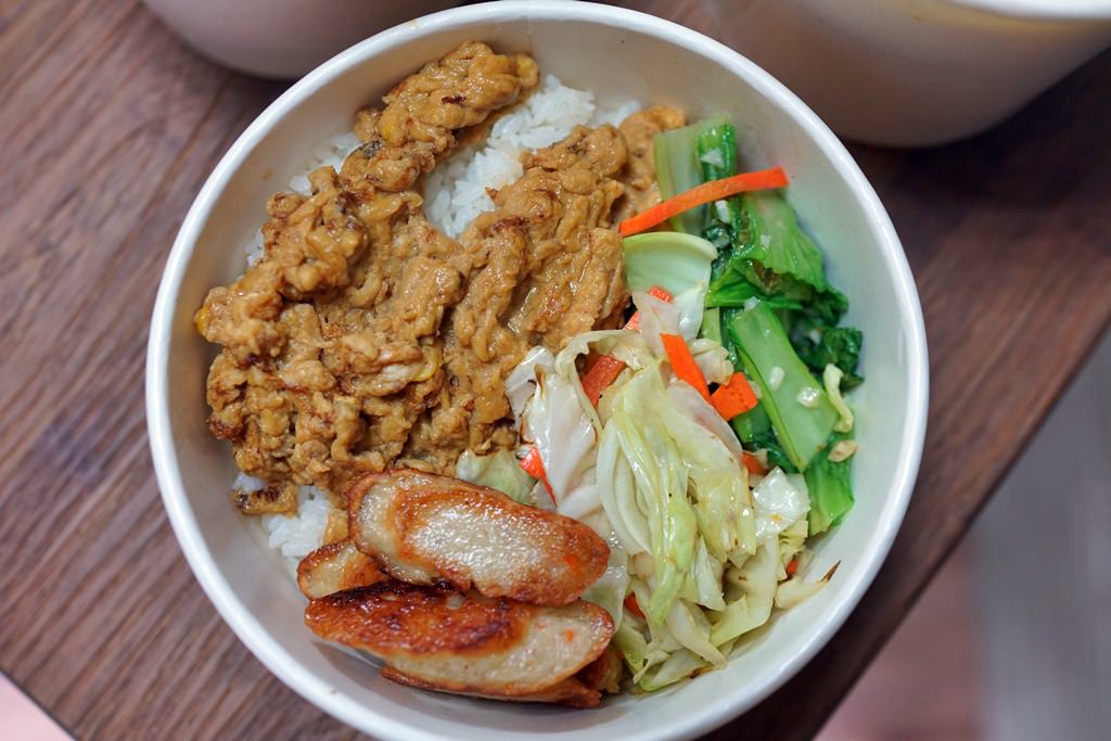 包含醬油煎蛋及三樣小菜,算蔬食不是素食喔!使用龜甲萬醬油所煎的醬油煎蛋,真的有龜甲萬的味道,保有厚度的口感,鹹香帶勁,就是要大口配飯、大口吃菜!