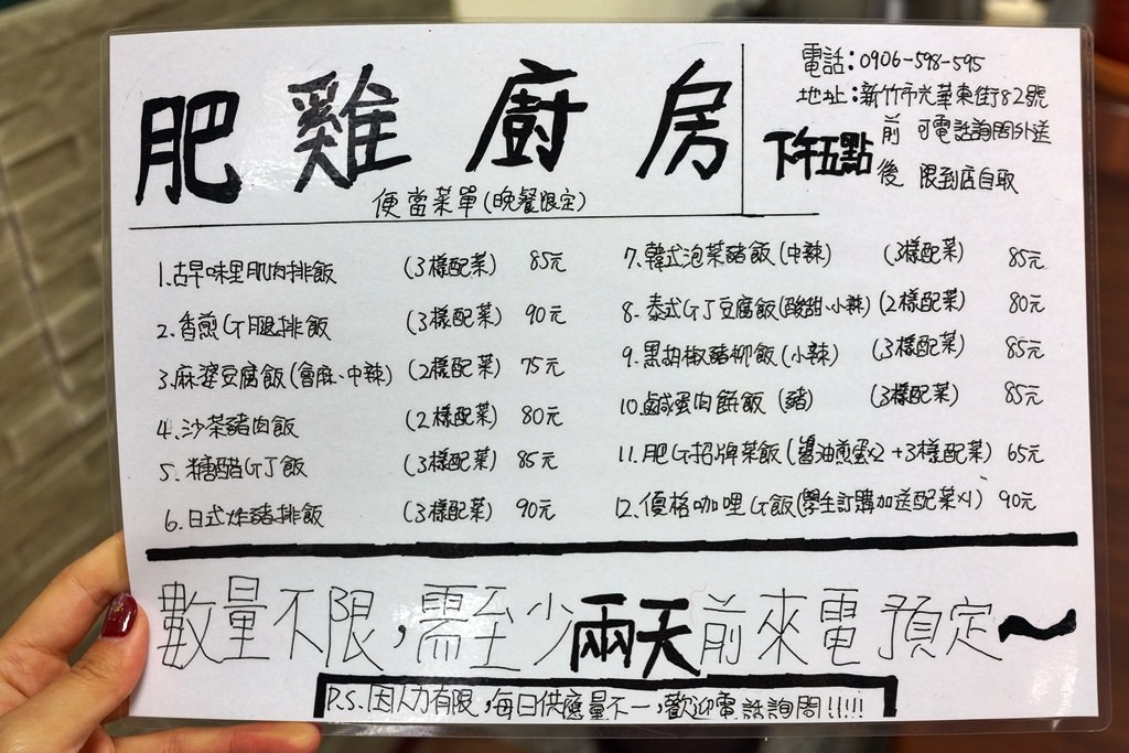 新竹光華國中周邊!一人廚房、用心好料理~最近和儒儒一起去訪了一間很特別的「肥雞廚房(肥G廚房)」,老闆當廚師多年,一直希望能做好吃的料理跟大家分享,秉持每項料理都手工製作,從湯頭、咖哩到手工薯條、唐揚雞,不用加工品,全都自己來,想讓大家吃到特別又安心的料理,店家只提供外帶,希望將裝潢省下的成本,全都回饋在食物裡!